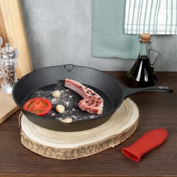 Táto celoliatinová panvica v čiernej farbe je ideálna na vyprážanie, dusenie aj pečenie. Liatina sa zohrieva rovnomerne a dlho udržiava vysokú teplotu, takže steaky, zelenina aj zemiaky získajú perfektnú štruktúru a zostanú dlhšie teplé. Silikónový návlek v červenej farbe zabezpečuje bezpečný úchop bez rizika popálenia.