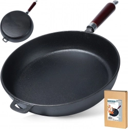 Univerzálna liatinová panvica s priemerom 30 cm na každodenné varenie doma aj vonku. Vďaka masívnemu telu výborne vedie a udržuje teplo, má hlboké steny, ergonomickú drevenú rukoväť a pomocné uško na bezpečné prenášanie. Vhodná na indukciu, plyn, elektrinu, sklokeramiku, halogén aj do rúry po zložení rukoväte.