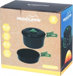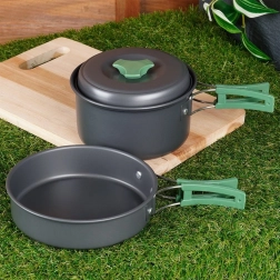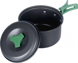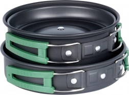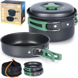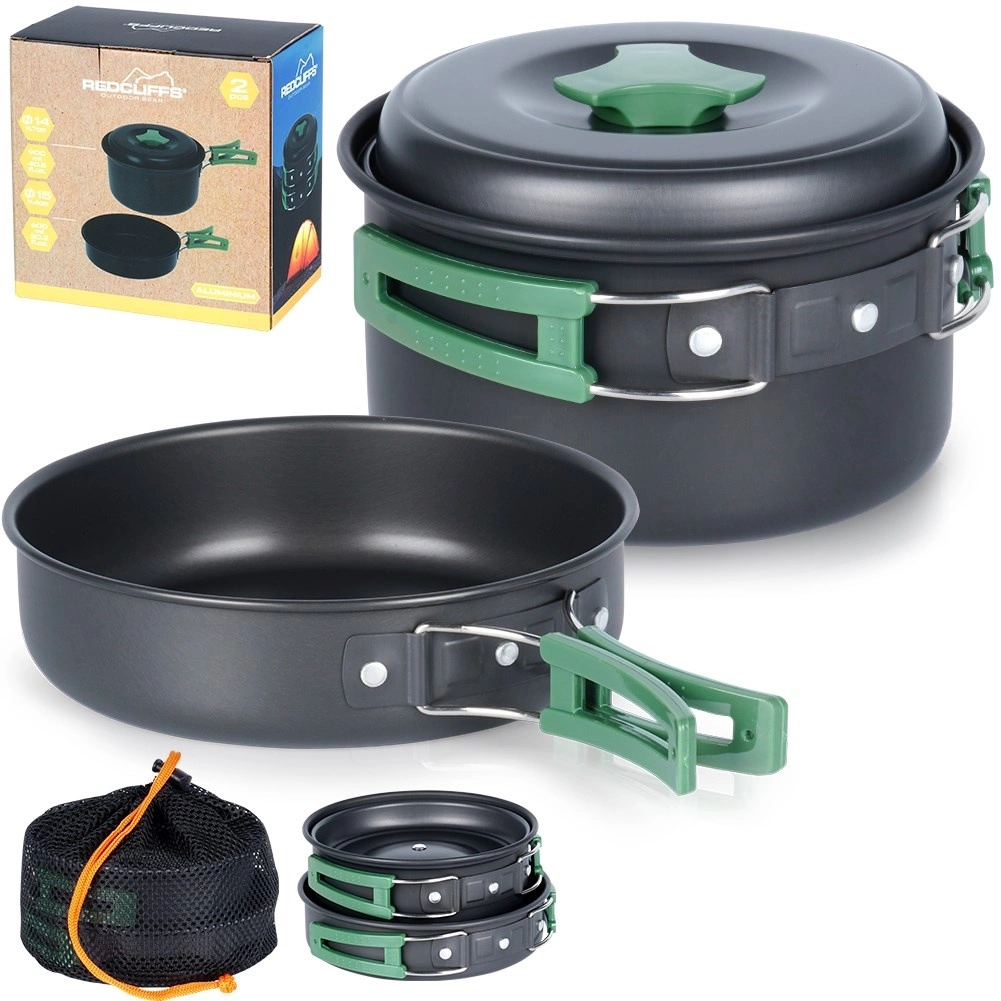 Kompaktná sada kempingového riadu obsahuje rendlík s pokrievkou (900 ml) a malú panvicu (500 ml) z anodizovaného hliníka so skladacími rukoväťami. Je ľahká, odolná proti korózii a poškriabaniu, vhodná na varenie na varičoch aj pri ohni a po zložení sa zmestí do každého batohu. Súčasťou je praktický sieťovaný obal.