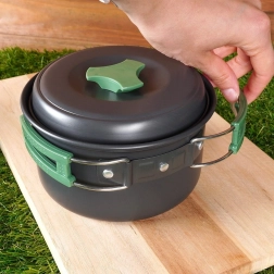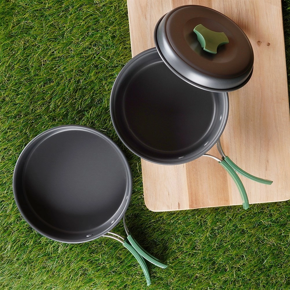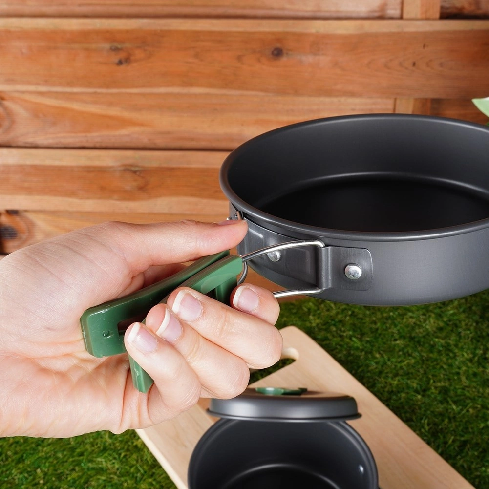 Táto ľahká a odolná sada riadu je ideálna na kempovanie, turistiku aj pikniky. Anodizovaný hliník zabezpečuje rýchly a rovnomerný ohrev, dlhú životnosť a jednoduchú údržbu. Vďaka skladacím rukovätiam a stohovateľnému dizajnu sa celý set zmestí do kompaktného balíčka, ktorý ľahko uložíte do batohu.