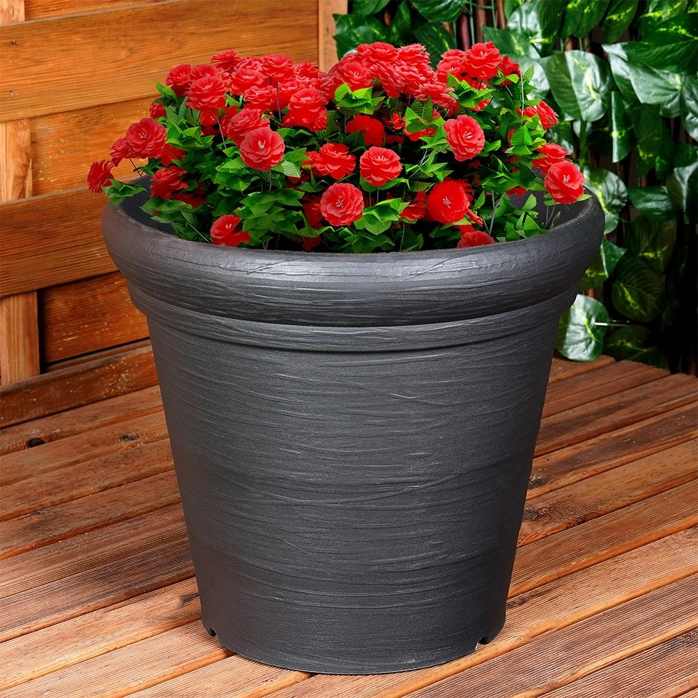 Štýlový plastový kvetináč v čiernej farbe na vonkajšie aj celoročné použitie. Ponúka odolnosť voči poveternosti, nízku hmotnosť, elegantný štruktúrovaný povrch a praktické rozmery 38 × 34 cm pre kvety, bylinky aj okrasné dreviny.