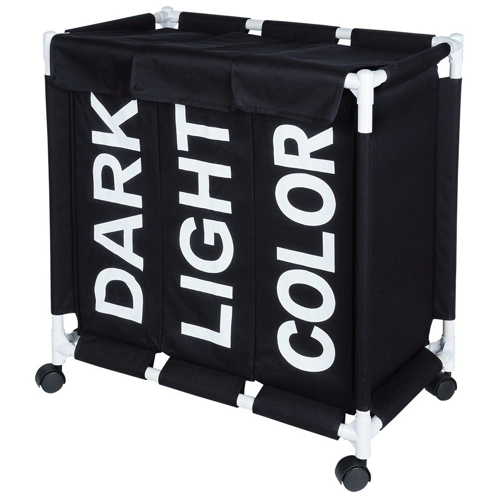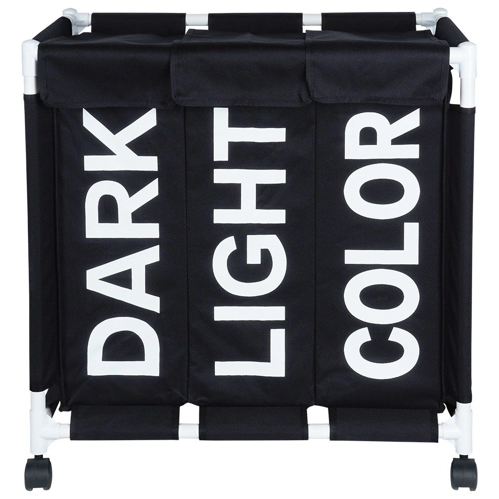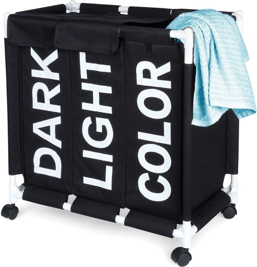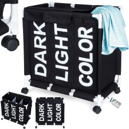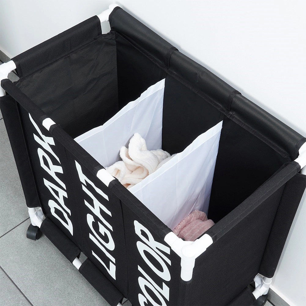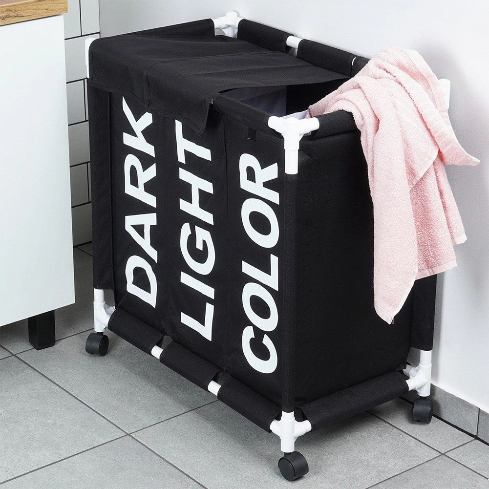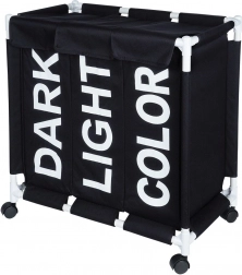 Praktický trojkomorový kôš na bielizeň na kolieskach s objemom 137 l uľahčí triedenie bielizne na dark, light a color. Ľahký, ale stabilný rám z odolného plastu, pevné polyesterové vaky a 4 otočné kolieska pre jednoduché presúvanie z izby do kúpeľne či práčovne. Každá komora má samostatné veko na suchý zips, ktoré pomáha obmedziť pachy a udržať poriadok.