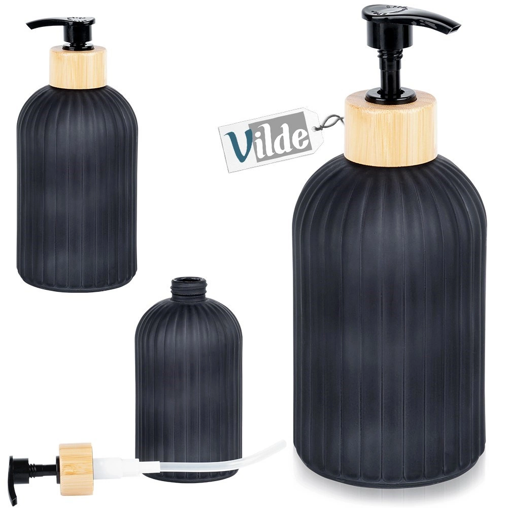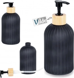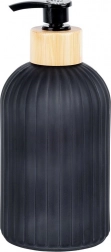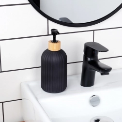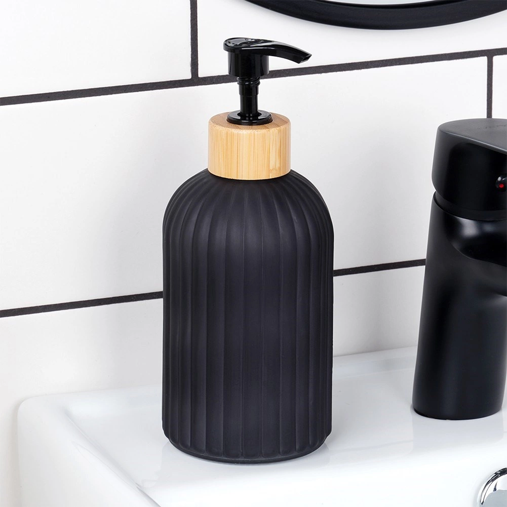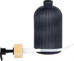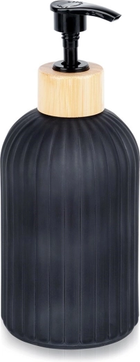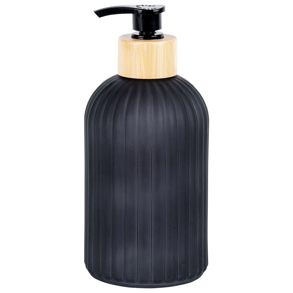 Elegantný sklenený dávkovač mydla s objemom 400 ml v matnom čiernom prevedení s prírodným bambusovým krúžkom a čiernou pumpičkou. Vďaka protišmykovej rebrovanej štruktúre sa dobre drží, ľahko sa dopĺňa a svojím moderným minimalistickým dizajnom ozdobí kúpeľňu aj kuchyňu. Praktická uzamykateľná pumpa uľahčuje prepravu a bráni úniku tekutiny.