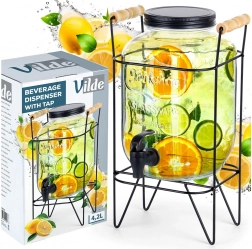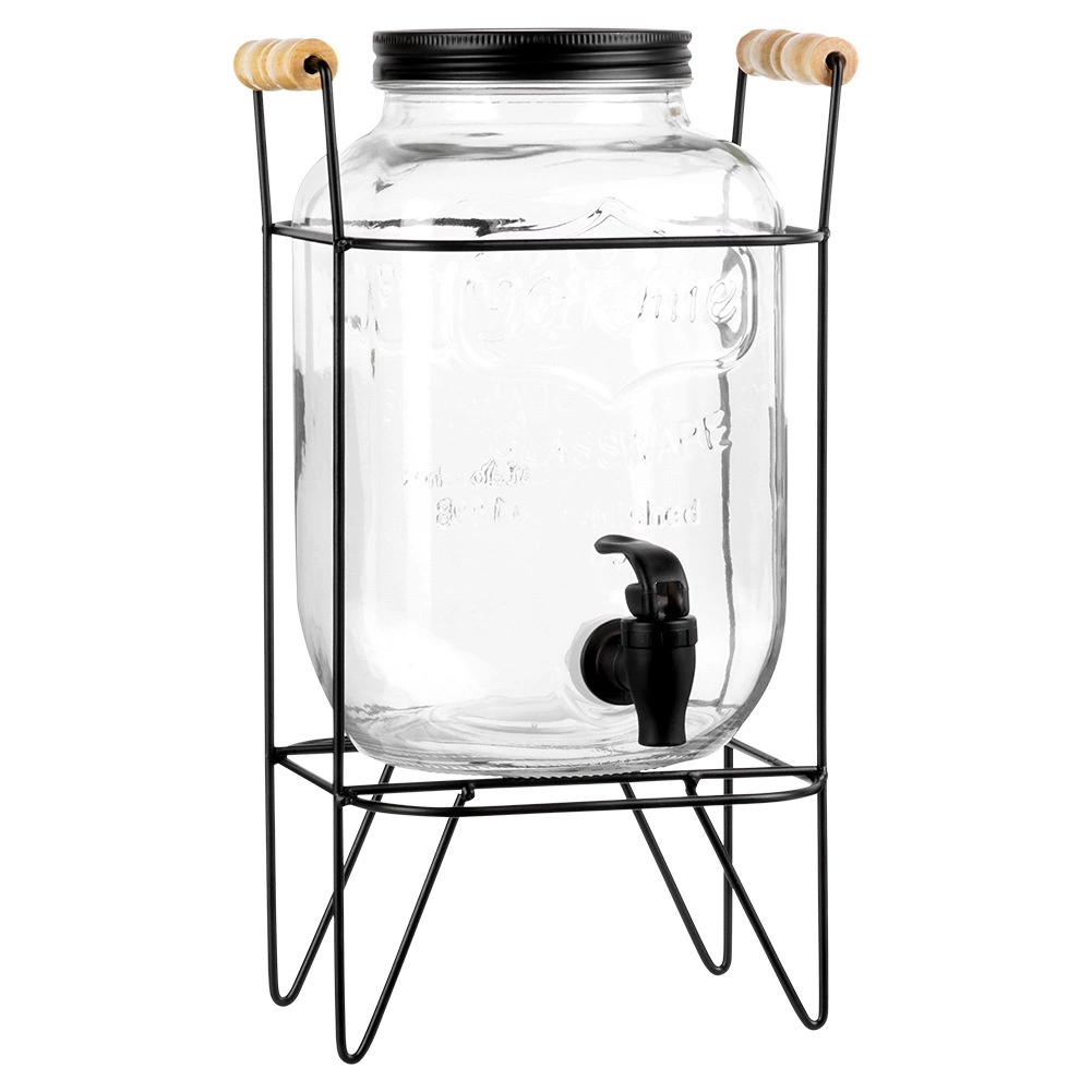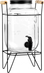 Štýlový sklenený dávkovač nápojov s objemom 4,2 l s praktickým kohútikom a stabilným kovovým stojanom v čiernej farbe. Ideálny na servírovanie limonád, džúsov, ľadového čaju či punču na záhradnú párty aj doma. Má skrutkovacie viečko, reliéfne zdobenie a pohodlné nalievanie vďaka zvýšenej polohe na stojane.