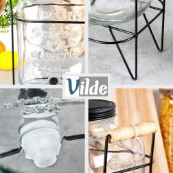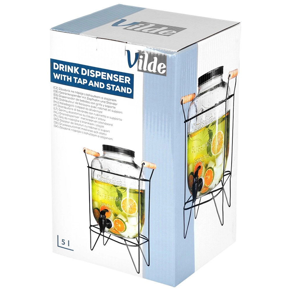Elegantný dávkovač z kvalitného hrubého skla vynikne na každom stole a uľahčí obsluhu hostí. Zvýšený stojan z matného kovu s drevenými madlami poskytuje priestor pre poháre pod kohútikom a zaisťuje stabilitu. Čierne skrutkovacie viečko chráni nápoj pred hmyzom a nečistotami.