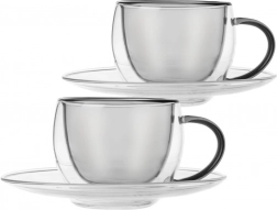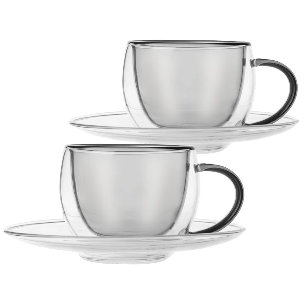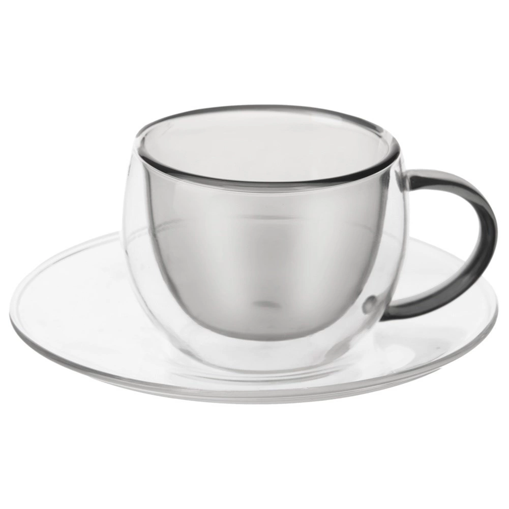 Objavte štýlové termo šálky, ktoré kombinujú moderný vzhľad a funkčnosť. Dvojitá stena z borosilikátového skla účinne izoluje teplo aj chlad, takže horúce nápoje nepália do ruky a studené zostávajú dlhšie svieže. Každý šálok má 90 ml, rozmery 9 × 6,5 × 5,5 cm a dopĺňa ho dokonale padnúci tanierik s priemerom 12 cm.