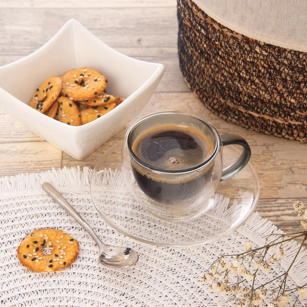 Transparentný dizajn s tmavým nádychom nechá vyniknúť farbu kávy aj cremu – servírujte espresso efektne a elegantne.