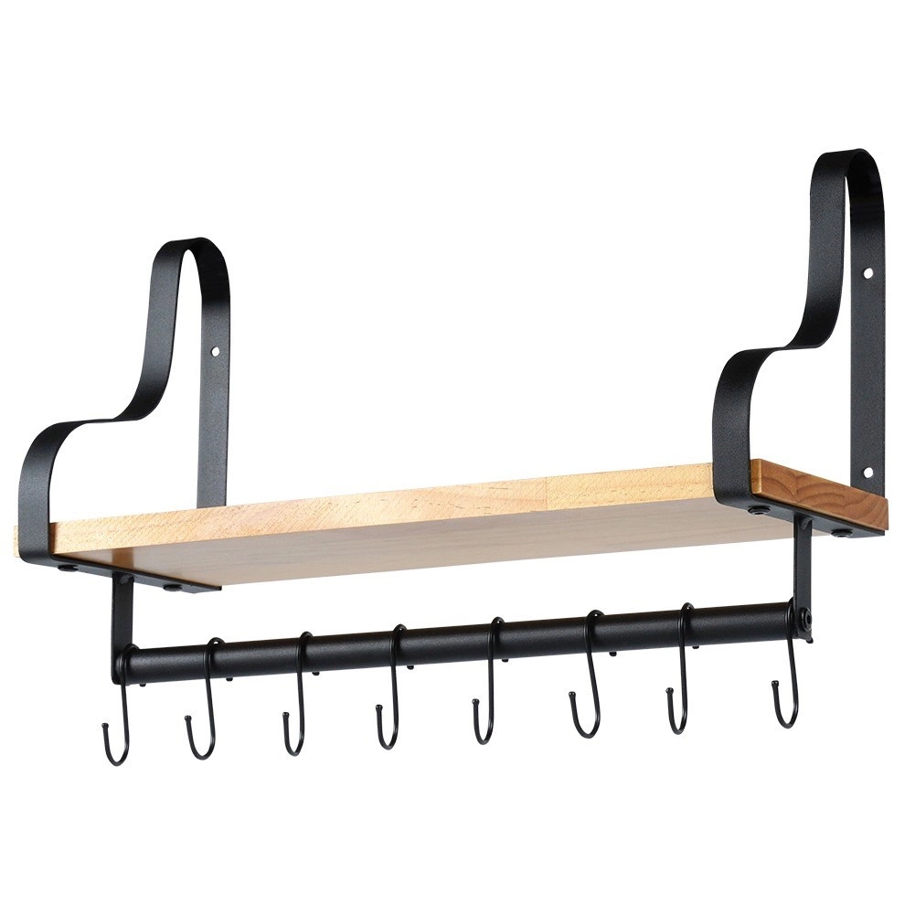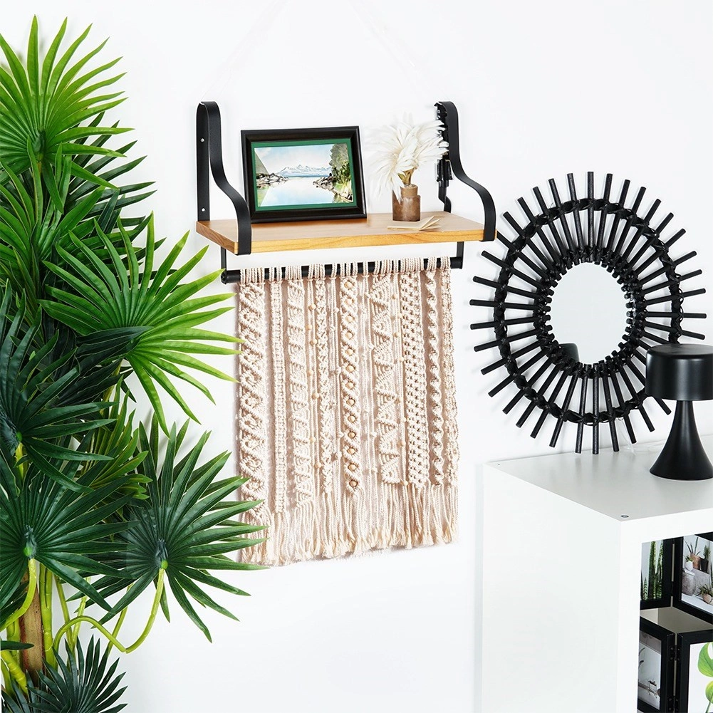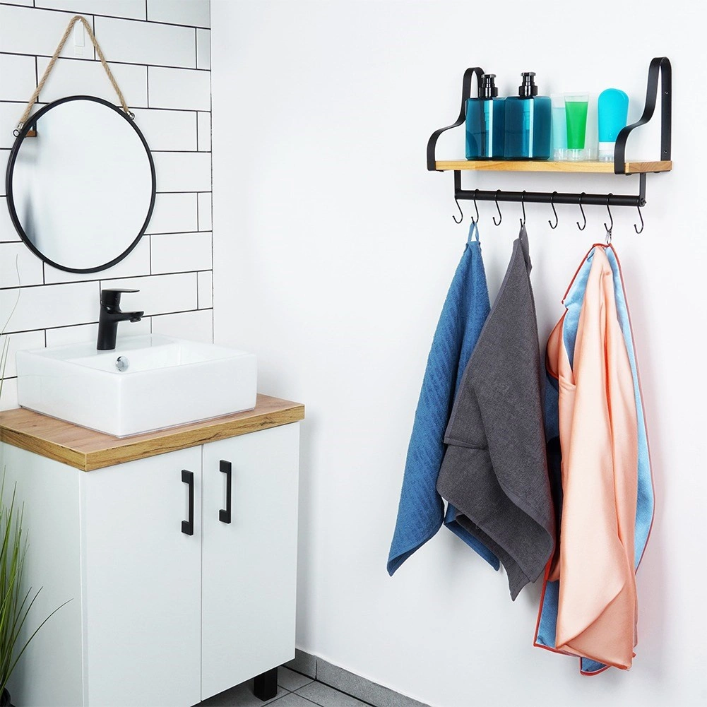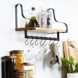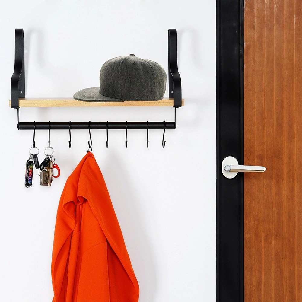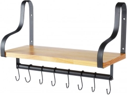 Objavte inteligentné riešenie pre organizáciu domácnosti. Táto nástenná polica ponúka stabilnú odkladaciu plochu z prírodného dreva a pod ňou užitočný reling s 8 háčikmi na zavesenie hrnčekov, utierok, kľúčov alebo uterákov. Minimalistický kovový rám v čiernej farbe podčiarkuje moderný industriálny vzhľad, ktorý ľahko zladíte s moderným aj klasickým interiérom.
