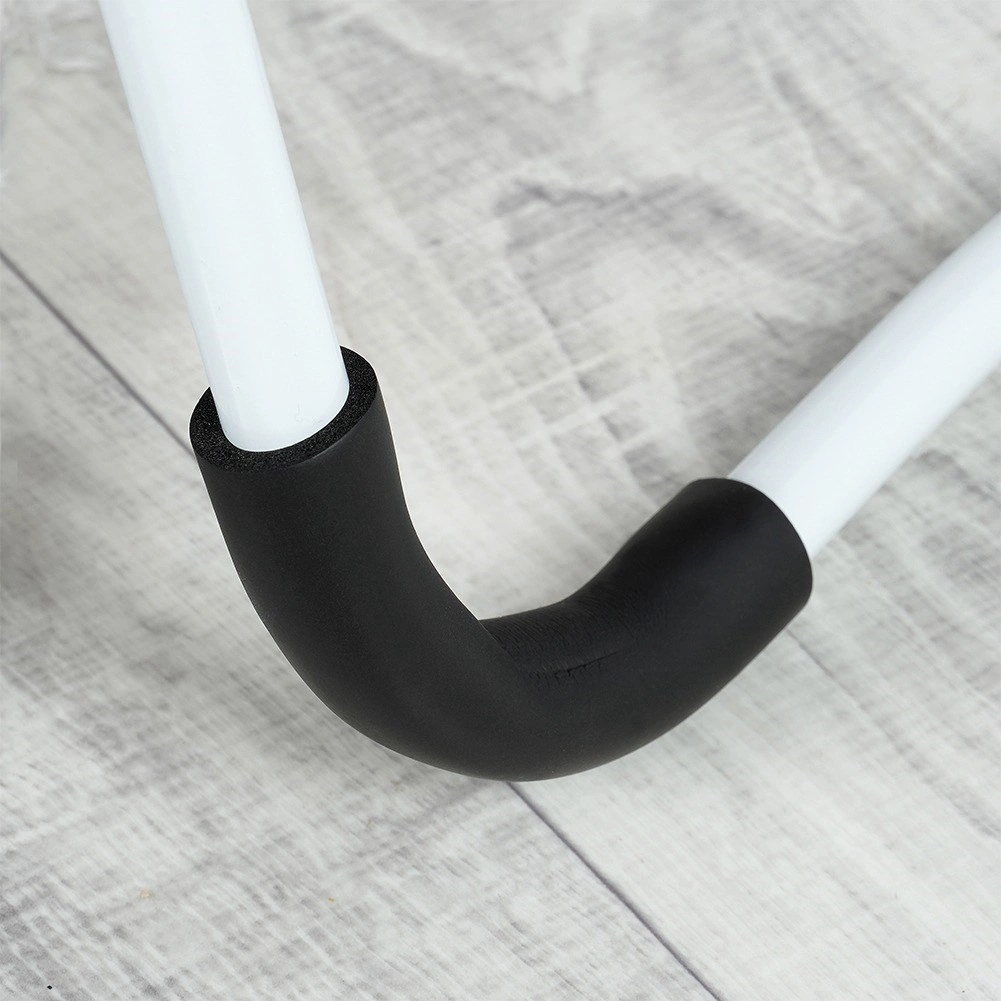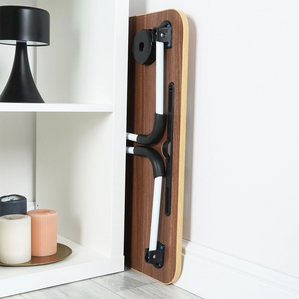Kovový rám v bielej farbe s protišmykovými koncovkami zaručuje stabilitu, zatiaľ čo ľahká doska z MDF v dekore svetlého dreva je príjemná na dotyk a ľahko sa čistí. Stolík sa rýchlo zloží naplocho pre úsporné uloženie za skriňu alebo pod posteľ.
