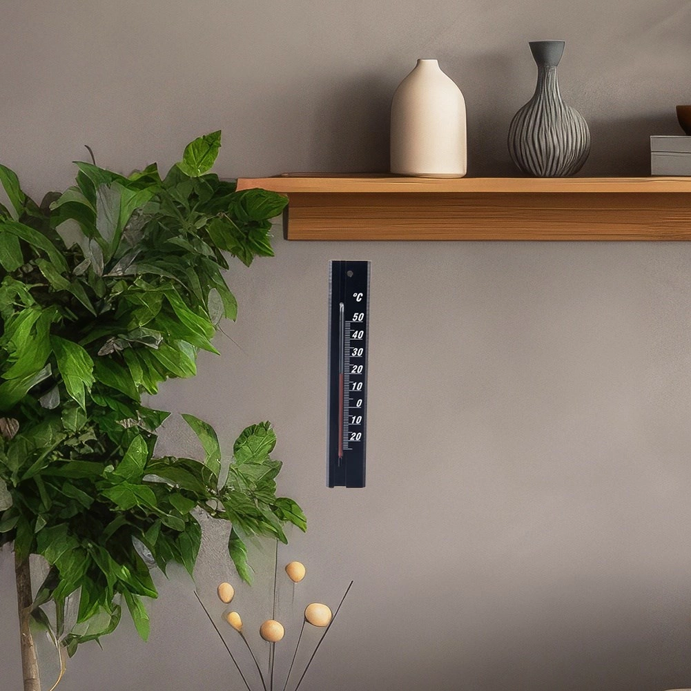 Univerzálny nástenný teplomer v elegantnom čiernom prevedení sa hodí do každého interiéru aj exteriéru. Prehľadná stupnica v stupňoch Celzia umožňuje rýchle a presné odčítanie aktuálnej teploty, či už v obývačke, kuchyni, na balkóne alebo na záhrade.