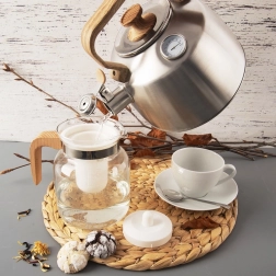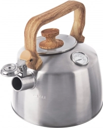 Táto klasická kanvica z nehrdzavejúcej ocele s nadčasovým vzhľadom je navrhnutá na rýchly ohrev vody a presné stráženie teploty. Vstavaný analógový teplomer vám pomôže nastaviť ideálnu teplotu pre rôzne druhy čaju či bylín, zatiaľ čo píšťalka bezpečne upozorní na dosiahnutie varu. Ergonomická rukoväť v imitácii dreva je príjemná na dotyk a zaisťuje pohodlnú manipuláciu.