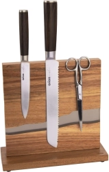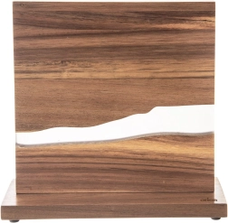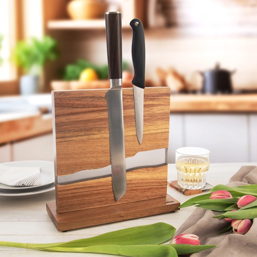 Stojan River kombinuje prírodnú krásu akáciového dreva s originálnou živicovou inlejou, ktorá pripomína tok rieky. Magnetická plocha po oboch stranách umožňuje prichytiť nože a kovové kuchynské náradie bez zasúvania do štrbín – ostrie máte vždy na očiach a po ruke. Stabilná základňa s plstenými nožičkami drží pevne na mieste a zároveň chráni pracovnú dosku.
