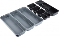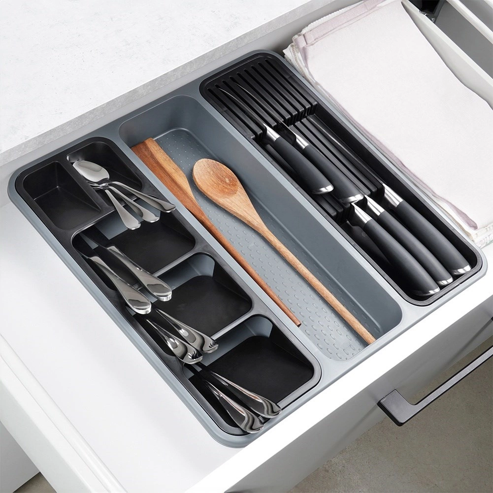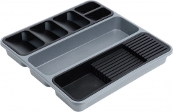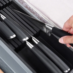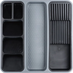 Praktický zásobník do zásuvky pre dokonalý poriadok v kuchyni. Má viac priehradiek, vyberateľné moduly a špeciálny blok na nože. Vďaka rozdeleným sekciám budete mať príbory, nože aj kuchynské náradie bezpečne uložené a vždy poruke. Z odolného plastu, ľahko sa čistí a je vhodný do umývačky.