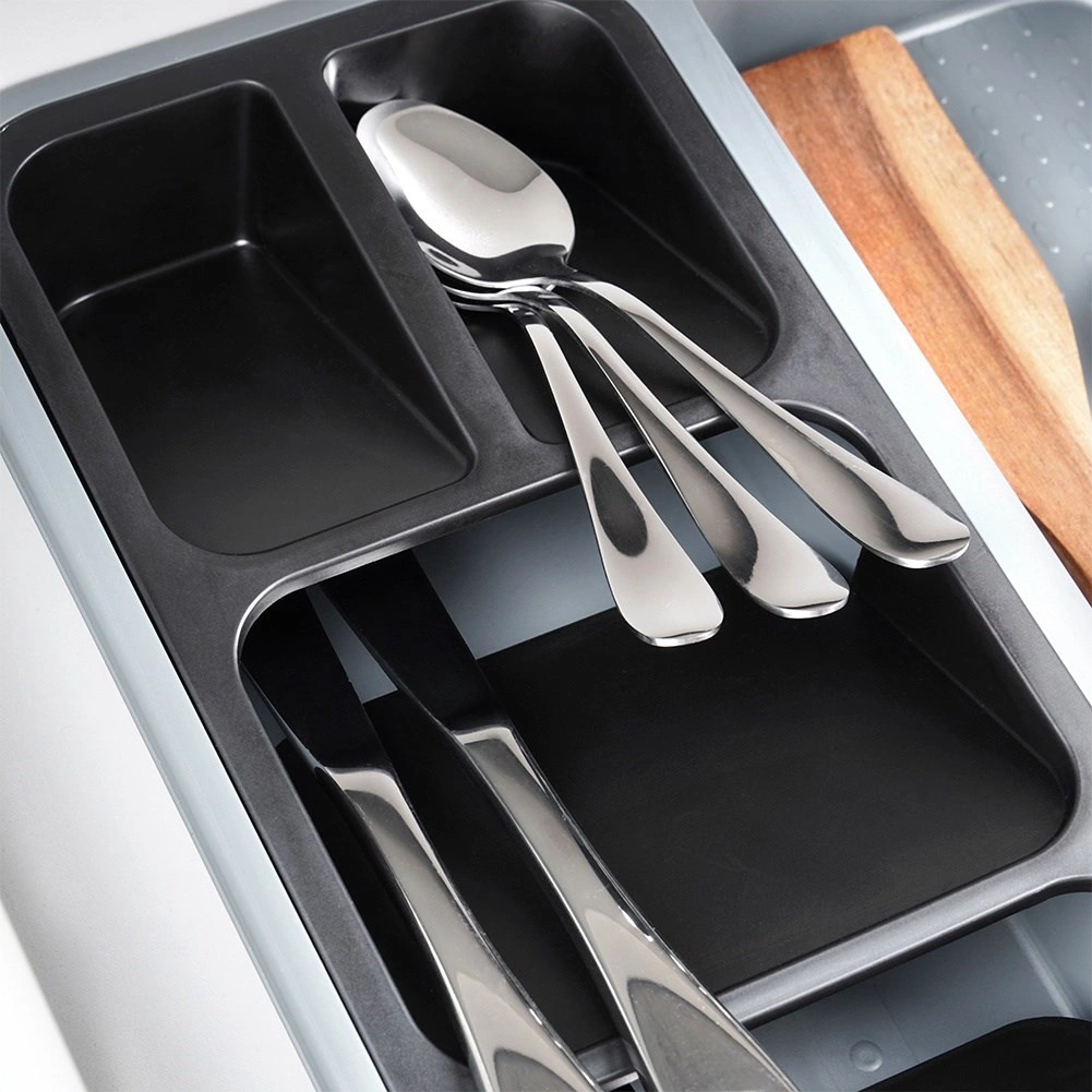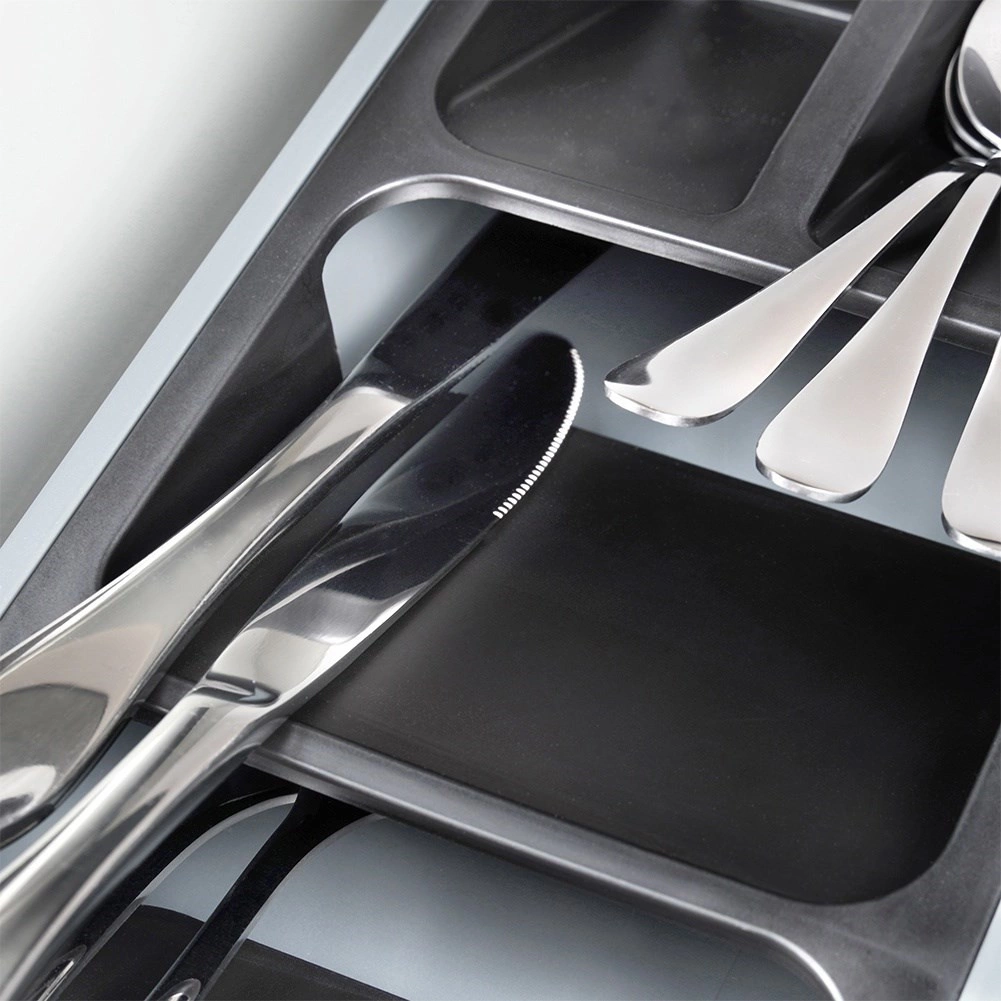 Vnútro stredovej priehradky je opatrené protišmykovým povrchom, ktorý zabraňuje posúvaniu príborov a náradia. Kvalitný plast v sivej farbe s čiernymi vložkami je odolný, ľahko sa udržiava a možno ho umývať v umývačke. Ideálny doplnok do každej kuchyne, ktorý šetrí priestor a zrýchli vaše varenie.
