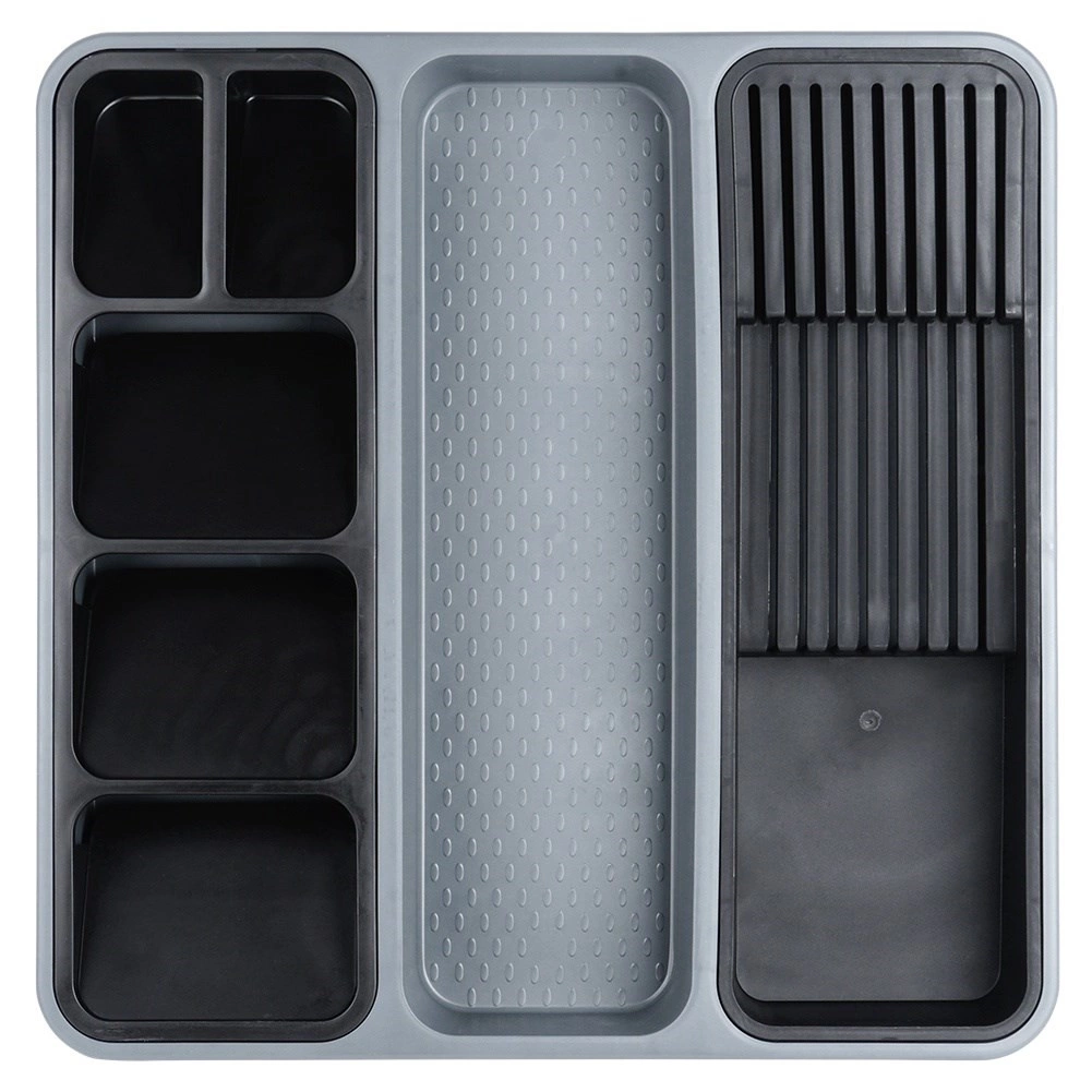 Usporiadajte svoju kuchyňu behom chvíľky. Tento sivý organizér s rozmermi 40 × 40 × 5 cm ponúka šikovné rozvrhnutie priehradiek vrátane vyberateľných vložiek – jedna je určená až pre 9 nožov, druhá pre prehľadné triedenie príborov. Vďaka tomu zostane každý kus na svojom mieste a v zásuvke bude vždy poriadok.