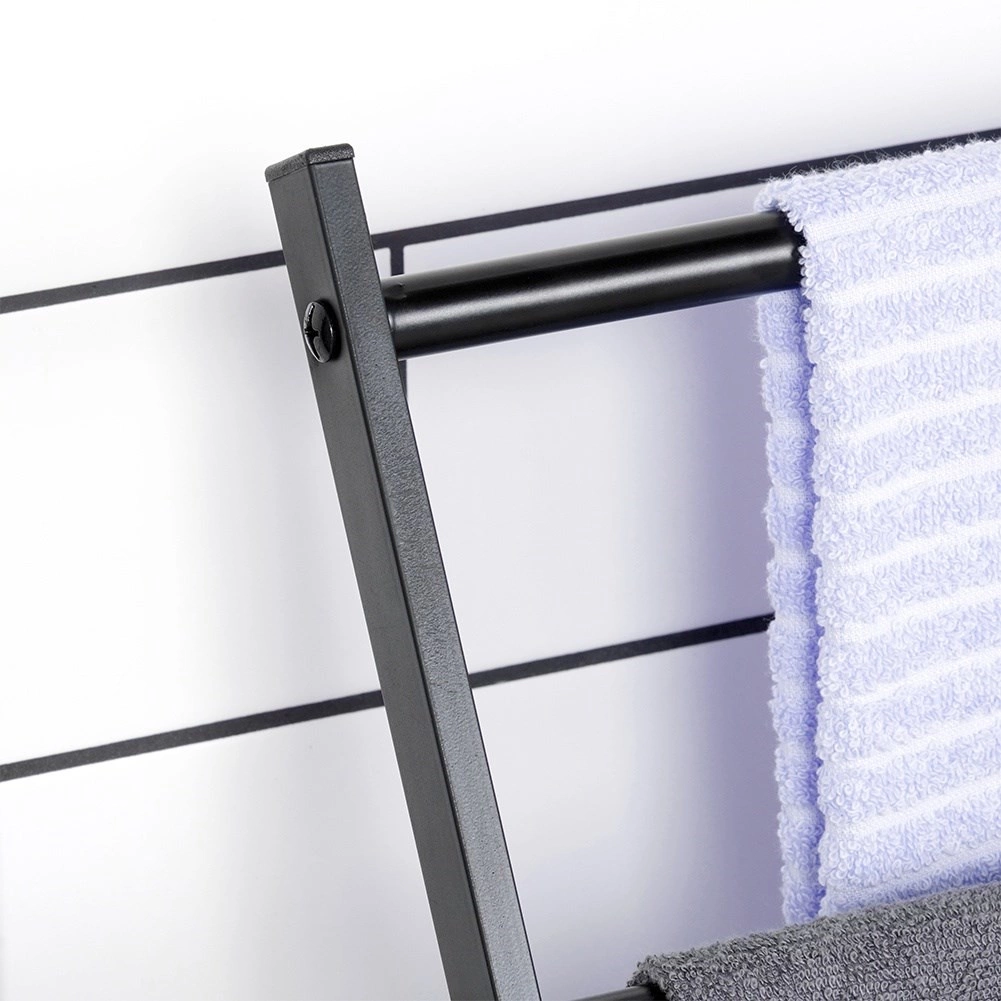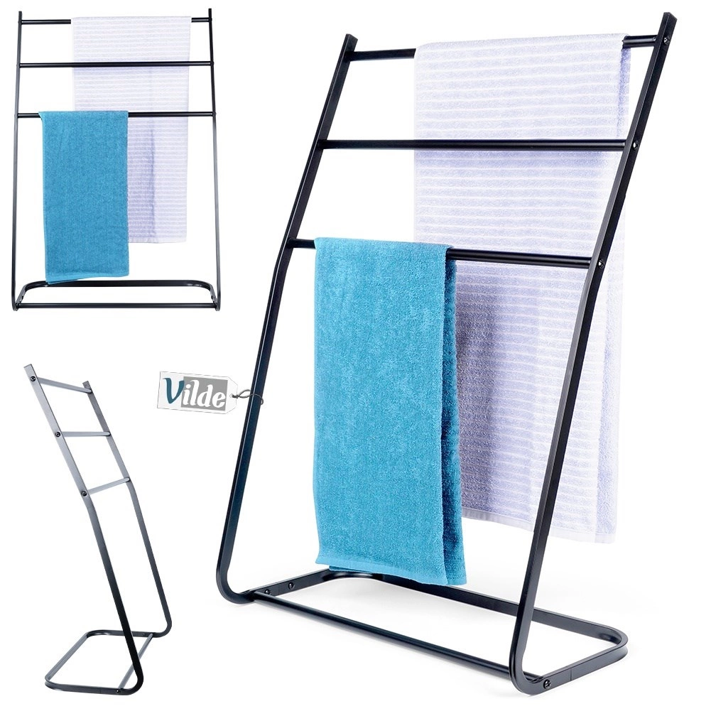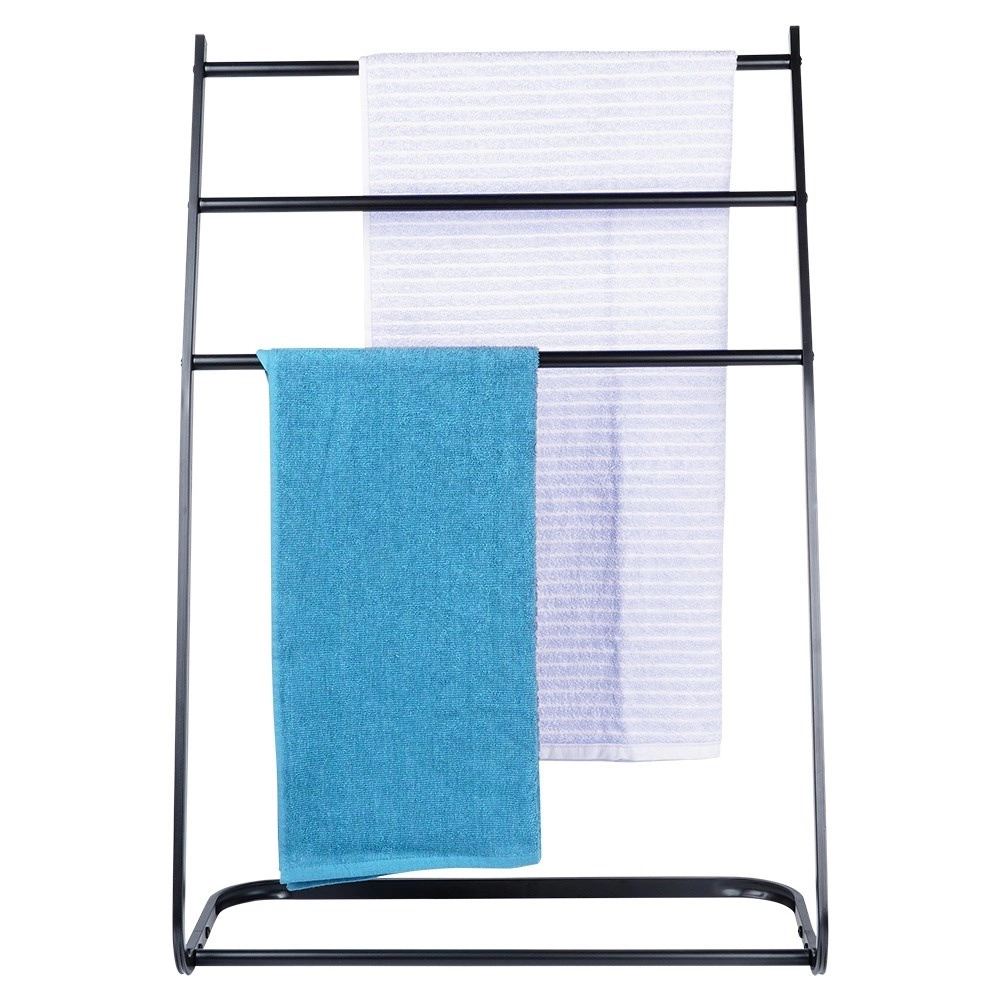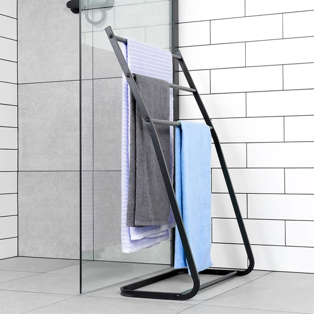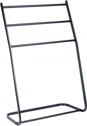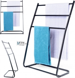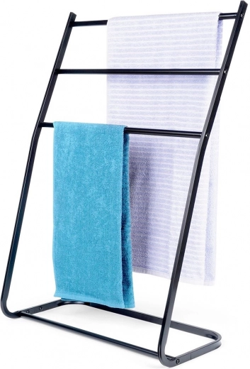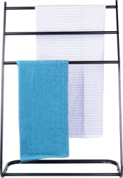 Voľne stojaci kovový stojan na uteráky alebo oblečenie ponúka tri pevné priečky v rôznych úrovniach pre optimálne prúdenie vzduchu a rýchlejšie sušenie. Minimalistický dizajn v čiernej farbe pôsobí čisto a nadčasovo, takže sa skvele hodí do kúpeľní v modernom aj klasickom štýle.