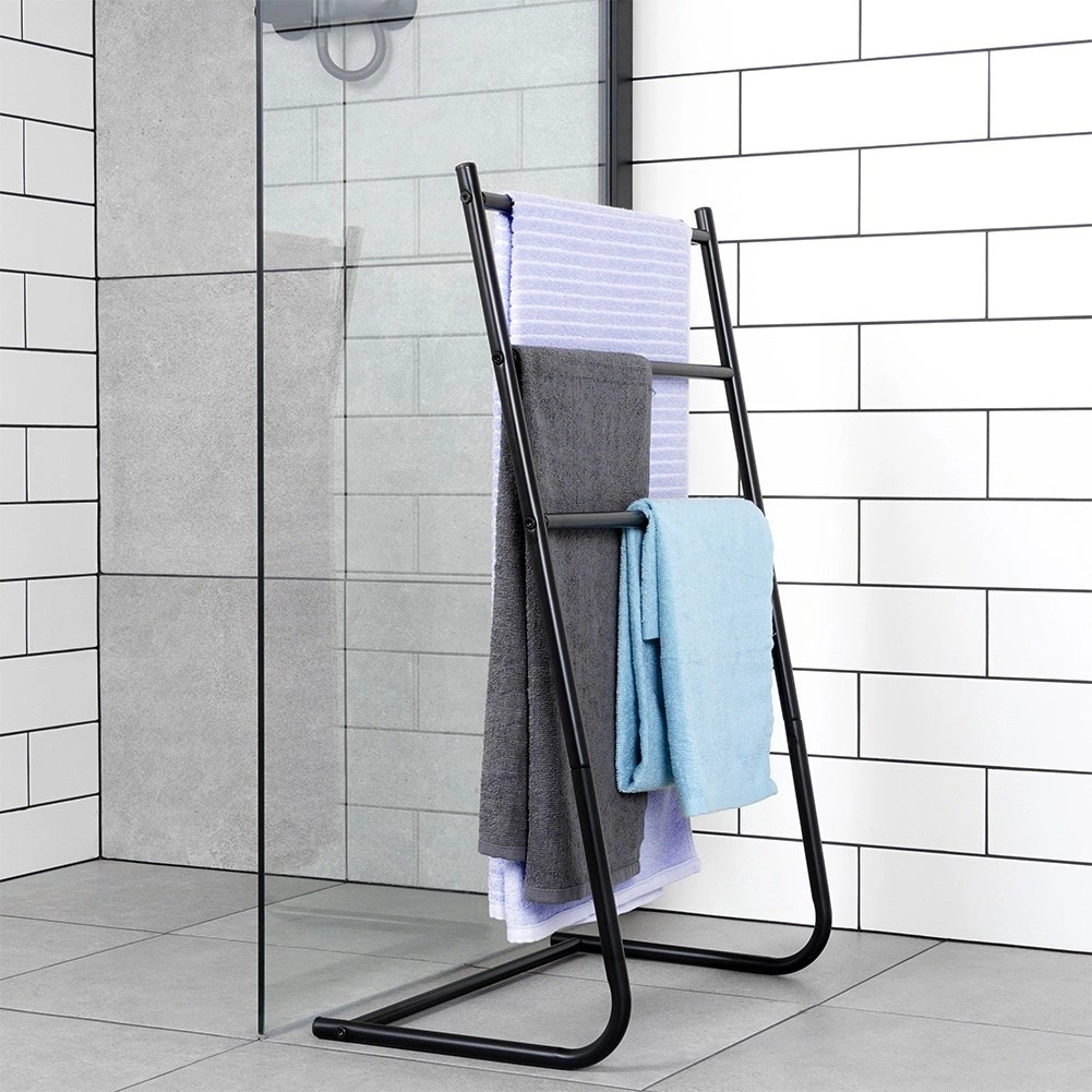 Vďaka trom úrovniam môžete uteráky rozvešať tak, aby rýchlejšie schli a zostali svieže. Minimalistický loftový dizajn v matnej čiernej farbe sa hodí do moderných aj klasických kúpeľní a zároveň slúži ako dekoratívny prvok.
