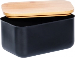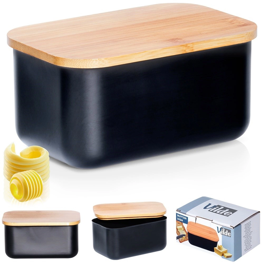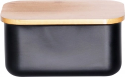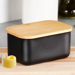 Elegantná čierna maslenka z ocele s prírodným bambusovým viečkom udrží maslo dlhšie čerstvé a pripravené na servírovanie. Má kompaktné rozmery 15 × 10 × 7,5 cm a nadčasový dizajn, ktorý sa hodí do každej kuchyne. Odolné prevedenie, praktické viečko na ochranu čerstvosti a ľahké čistenie z nej robia ideálny doplnok na stôl aj do chladničky.