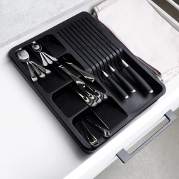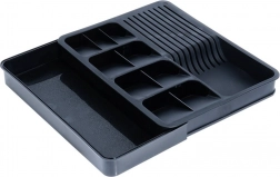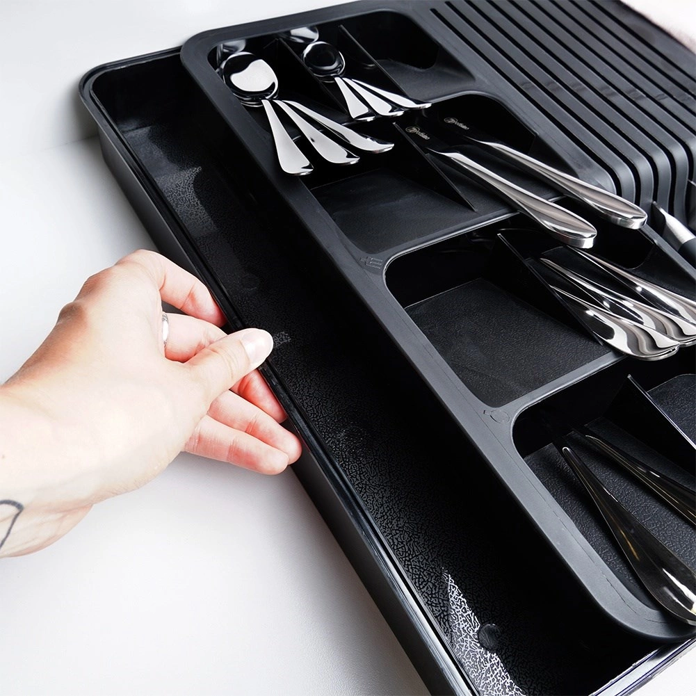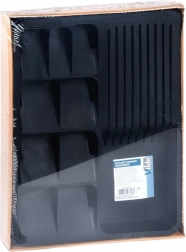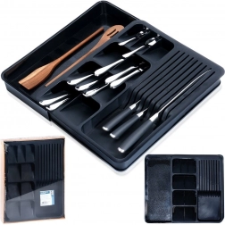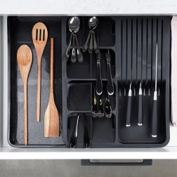 Praktický čierny vkladací organizér do zásuvky usporiada vaše príbory, kuchynské náradie aj nože na jednom mieste. Ponúka prehľadné priehradky a špeciálnu sekciu až pre 9 nožov. Základný rozmer 40 × 31 × 5 cm možno vďaka rozšíriteľnému dielu zväčšiť až na 45,5 cm pre viac úložného priestoru. Vyrobený z odolného plastu, ľahko sa čistí a udržiava poriadok v každej kuchyni.