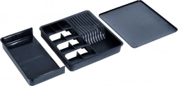 Organizér je vyrobený z kvalitného, pevného plastu v elegantnej čiernej farbe, je ľahko umývateľný a odolný voči každodennému používaniu. Ideálna voľba do modernej kuchyne, kde oceníte poriadok, rýchly prístup k nástrojom a bezpečné uloženie ostrých čepelí.