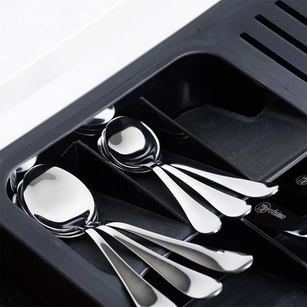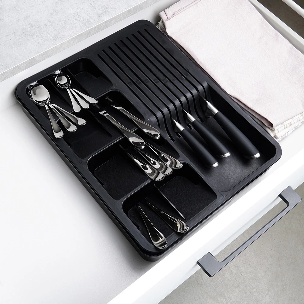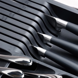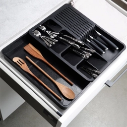 Udržujte zásuvky dokonale prehľadné. Rozťahovateľný vkladací organizér do zásuvky ponúka šikovné rozvrhnutie priehradok pre lyžice, vidličky, nože aj kuchynské náradie a dedikovaný blok na bezpečné uloženie až deviatich nožov. Vďaka rozšíriteľnému dielu si ľahko prispôsobíte šírku úložného priestoru a využijete každý centimeter zásuvky.