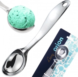 Praktická kovová naberačka na zmrzlinu LUXY s dĺžkou 17 cm na jednoduché porciovanie dokonale guľatých kopčekov. Vyrobená z kvalitného chrómovaného kovu s ergonomickou rukoväťou a otvorom na zavesenie. Vhodná aj na ryžu, kašu či pyré a možno ju umývať v umývačke.