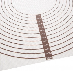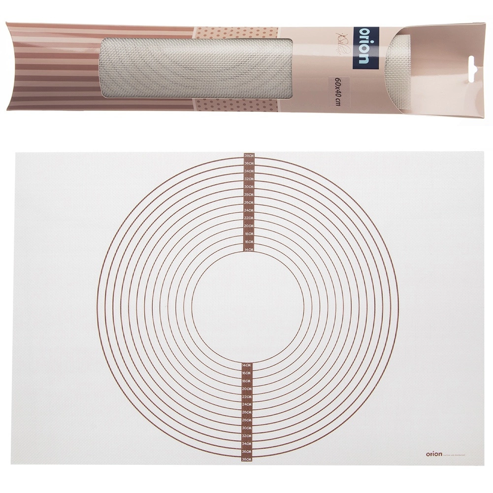 Praktická silikónová podložka s rozmermi 60 × 40 cm na vaľkanie a pečenie cesta s nepriľnavým povrchom, protišmykovou úpravou a meriacimi kruhmi a stupnicou v cm. Vhodná do rúry aj umývačky, odolná teplotám −40 °C až +220 °C a ľahko sa skladuje zrolovaním.