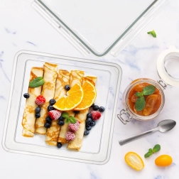 Táto nízka, štvorcová krabička na potraviny s objemom 900 ml prináša spoľahlivé a hygienické uchovávanie vašich jedál. Priehľadné telo umožňuje okamžitú kontrolu obsahu bez otvárania, zatiaľ čo pevné veko so 4 klipmi a silikónovým tesnením zaručuje tesnosť a minimalizuje úniky vôní.