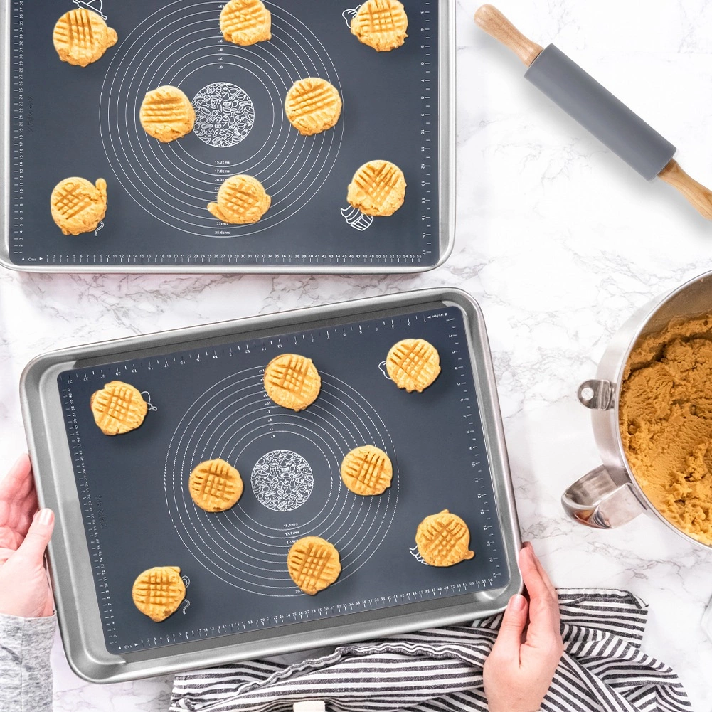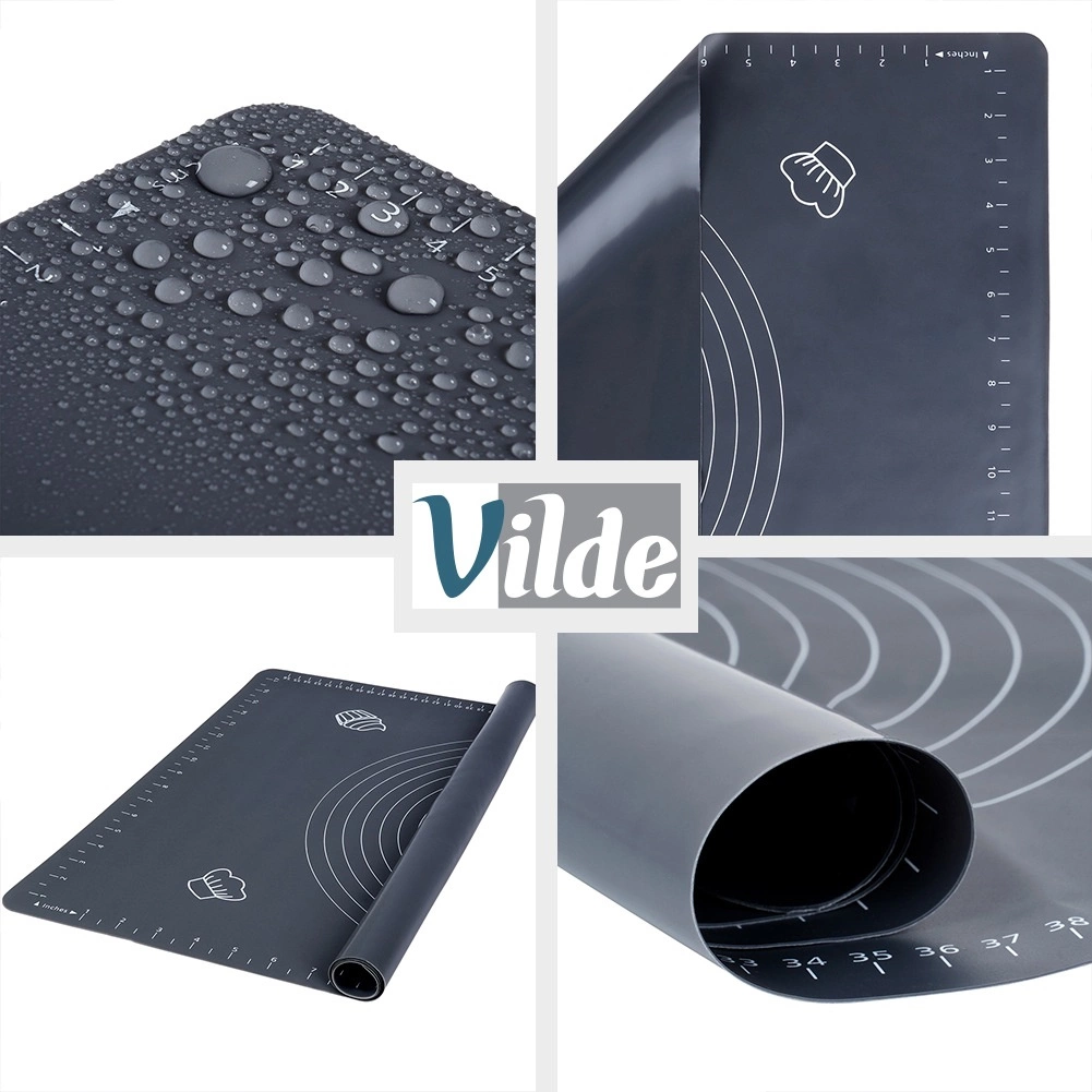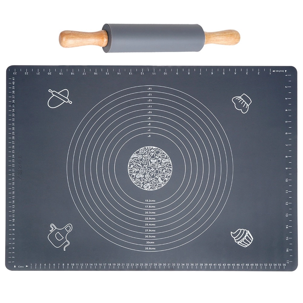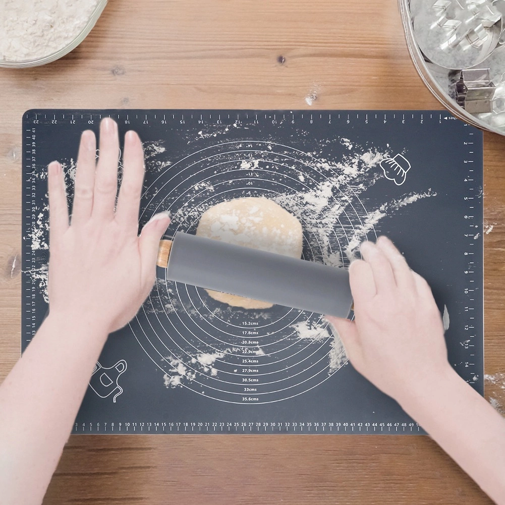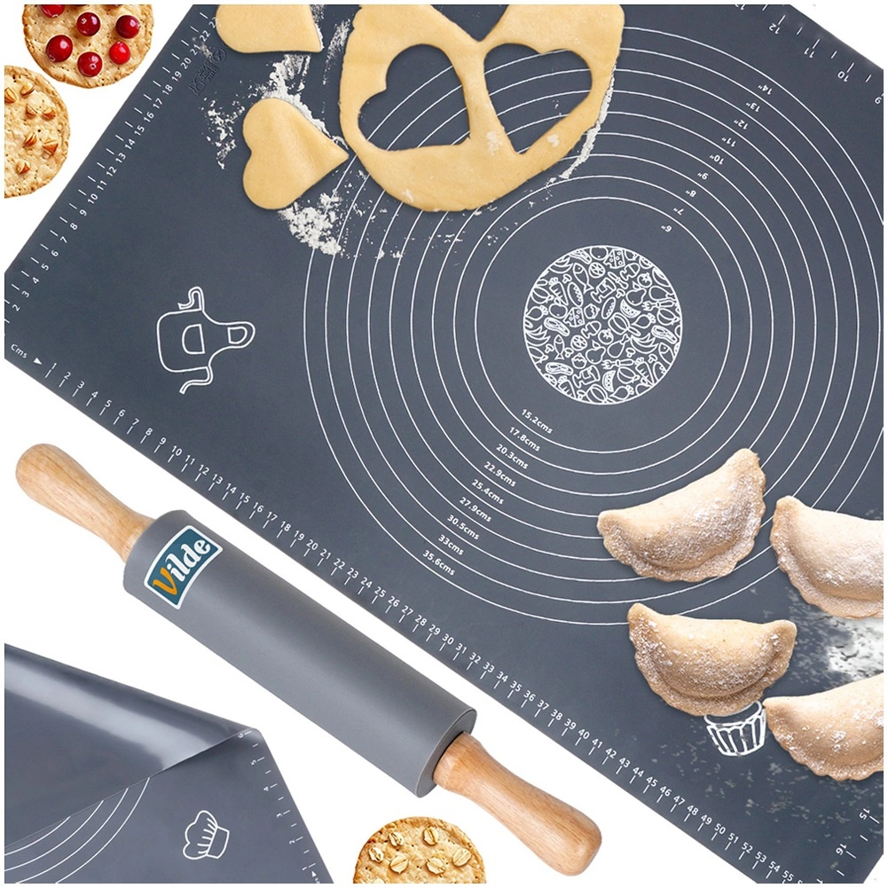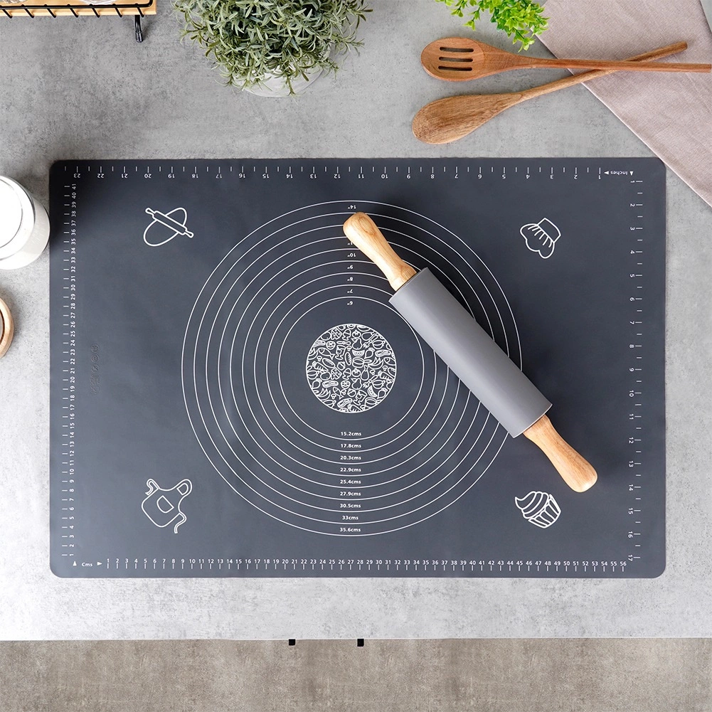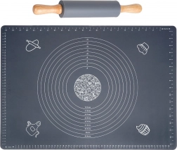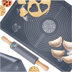 Táto univerzálna sada z kvalitného silikónu v elegantnej sivej farbe je ideálna na prípravu cesta na koláče, pizzu, sušienky, cestoviny aj knedličky. Podložka je nepriľnavá a protišmyková, takže pevne drží na pracovnej doske a cesto sa nelepí. Ľahko sa čistí, nepohlcuje pachy a rýchlo schne.