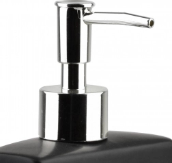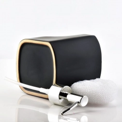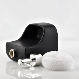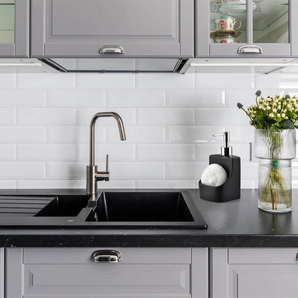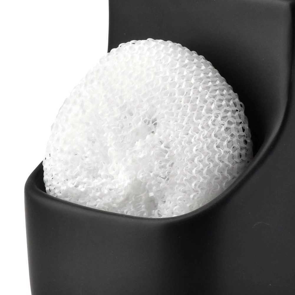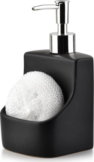 Štýlový dávkovač kombinuje nádobku na tekutý prostriedok s integrovaným úložným priestorom na hubku či handričku. Vďaka kompaktným rozmerom 9,5 × 9,5 × 19 cm sa skvelo hodí k drezu a pomáha udržať pracovnú plochu prehľadnú. Matná čierna keramika pôsobí elegantne a hodí sa do moderných, klasických aj industriálnych interiérov.