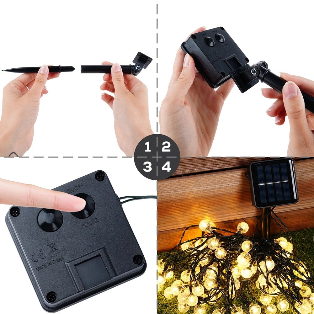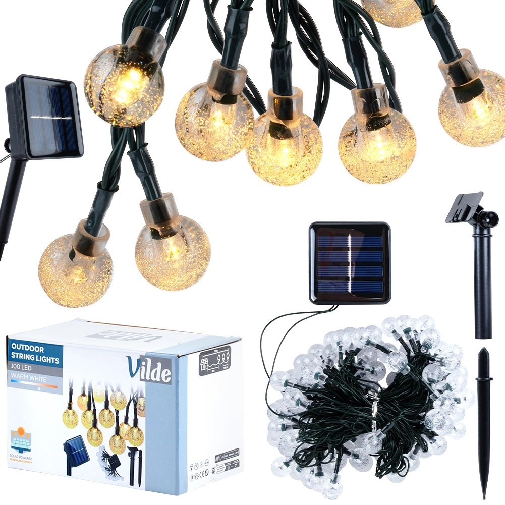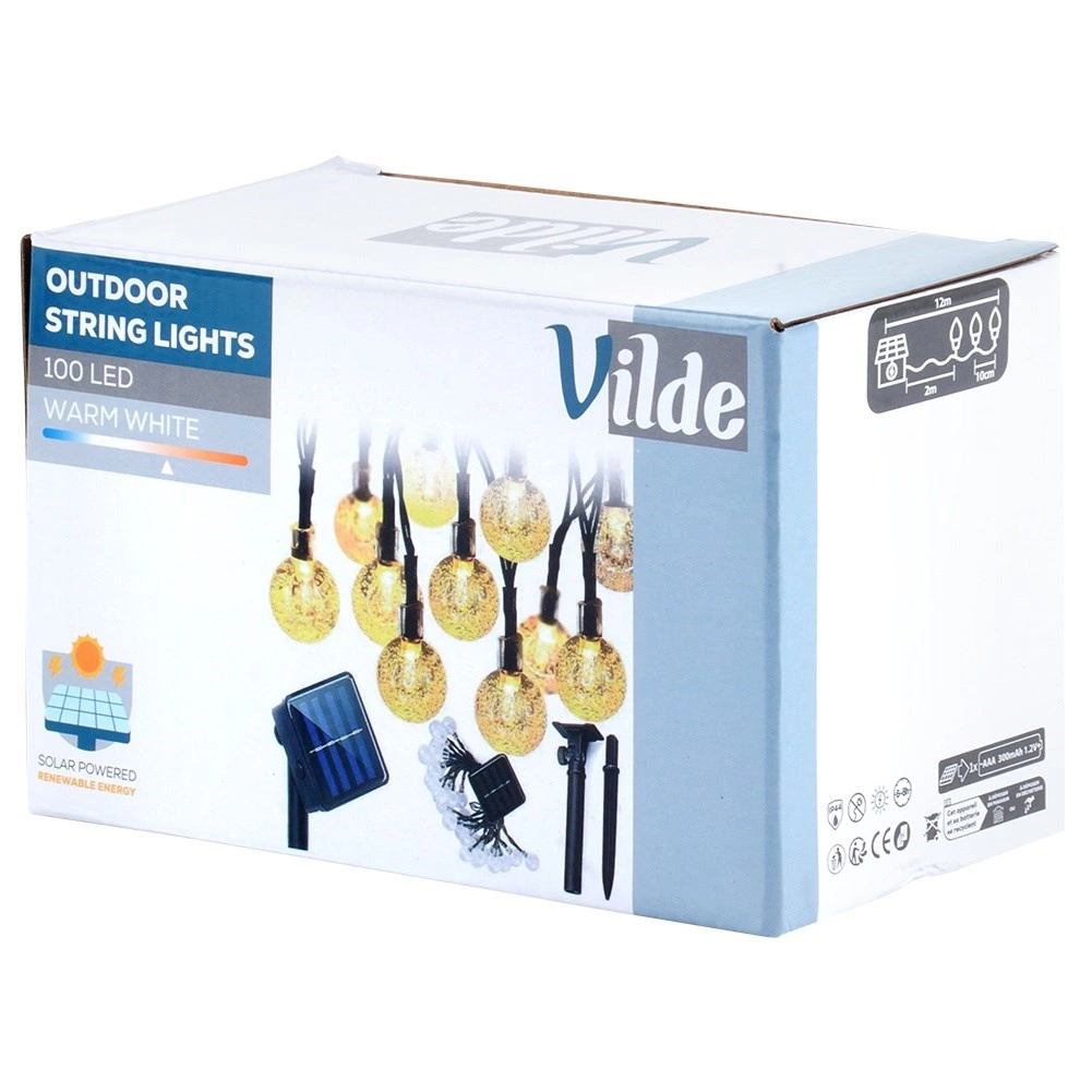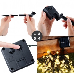 Solárna girlanda so 100 LED žiarovkami s priemerom cca 1,5 cm rozžiari každý vonkajší priestor príjemným teplým svetlom. Vďaka účinnému solárnemu panelu a integrovanému akumulátoru (1× AAA 1,2 V) sa cez deň nabíja a po zotmení sa automaticky postará o dlhotrvajúce a úsporné osvetlenie. Ochrana IP44 zaručuje spoľahlivosť aj pri premenlivom počasí.