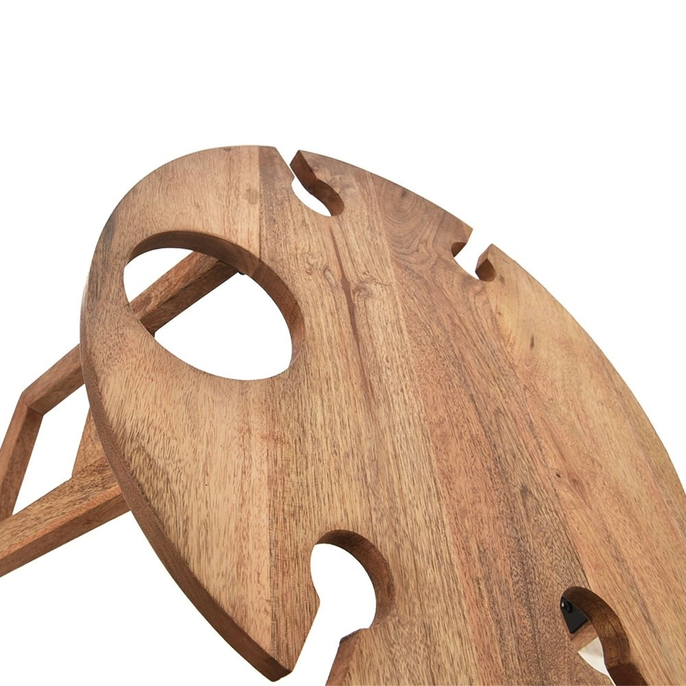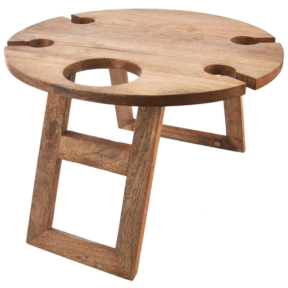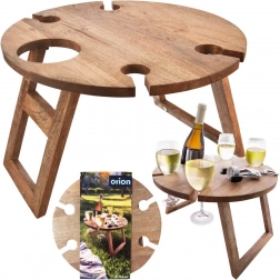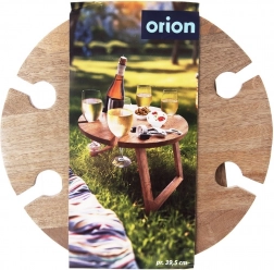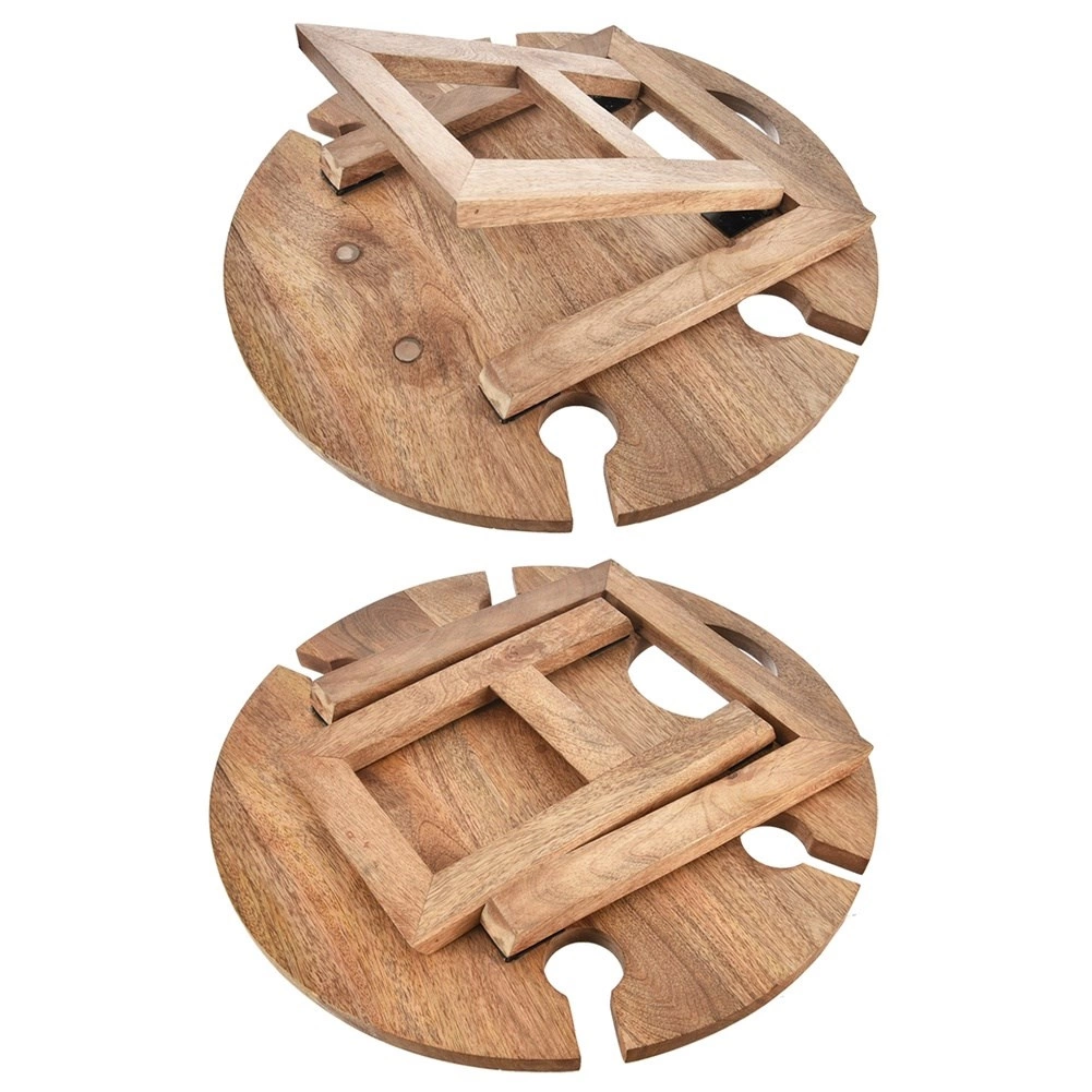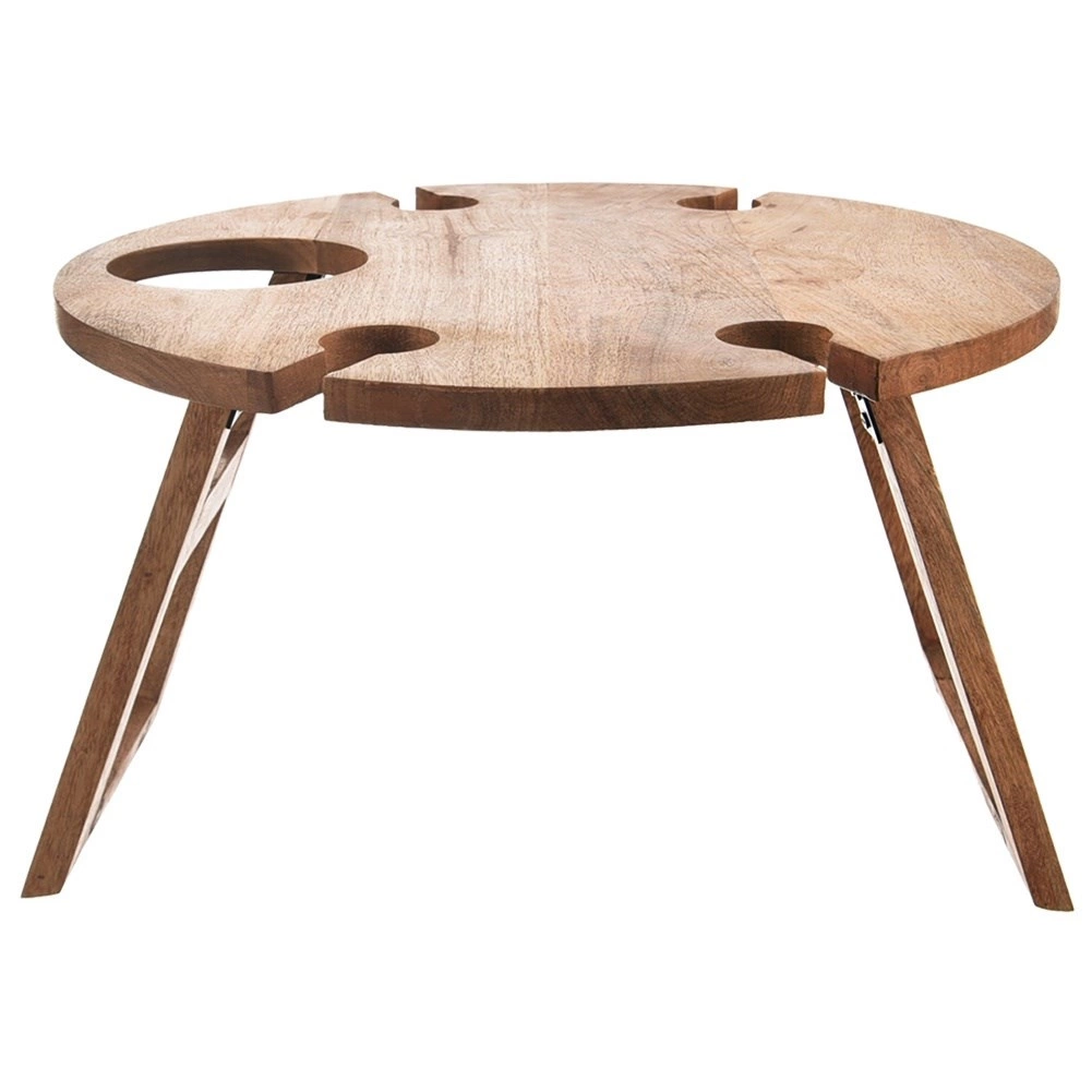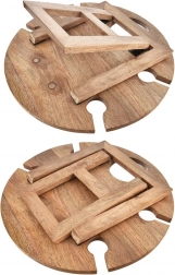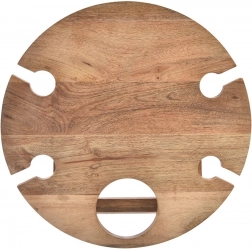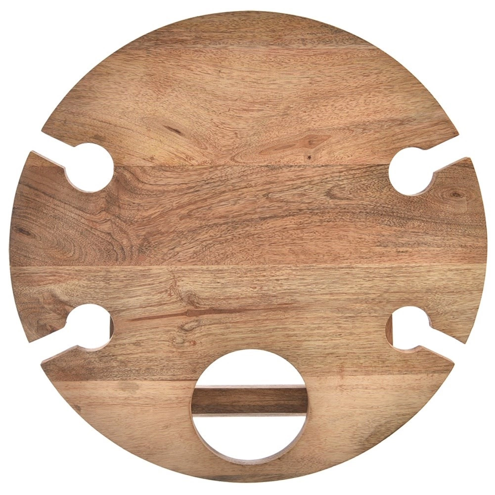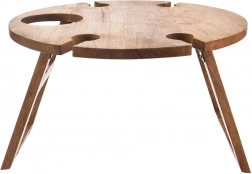 Kompaktný a štýlový piknikový stolík z odolného mangového dreva s vyrezanými držiakmi na štyri poháre a fľašu vína. Skladacie nohy zabezpečujú ľahké prenášanie a skladovanie, stabilná konštrukcia zas bezpečné servírovanie aj na tráve. Ideálny do záhrady, na balkón, terasu aj piknik.