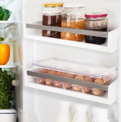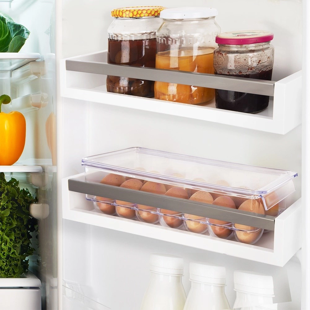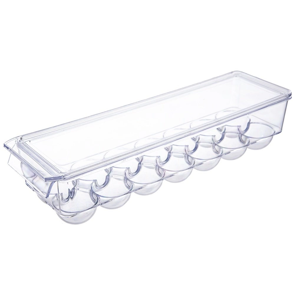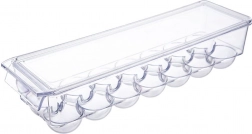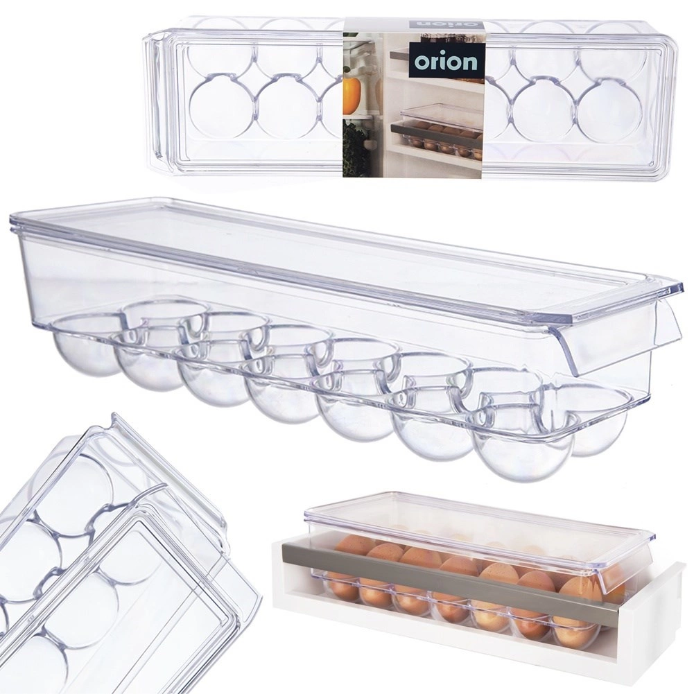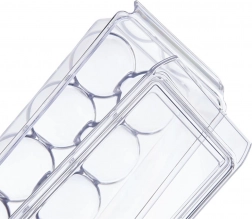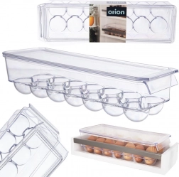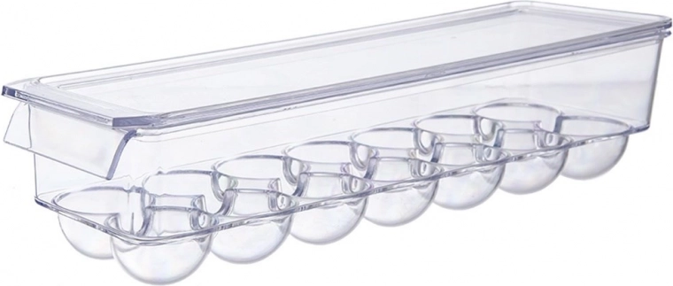 Praktický box na vajcia s rozmermi 36 × 10,5 × 8,5 cm je vyrobený z kvalitného, priehľadného plastu. Tvarované jamky držia vajcia stabilne, zabraňujú ich kotúľaniu a chránia ich pred nárazmi aj pohlcovaním pachov z chladničky. Veko umožňuje bezpečné stohovanie viacerých boxov a maximálne využitie priestoru.