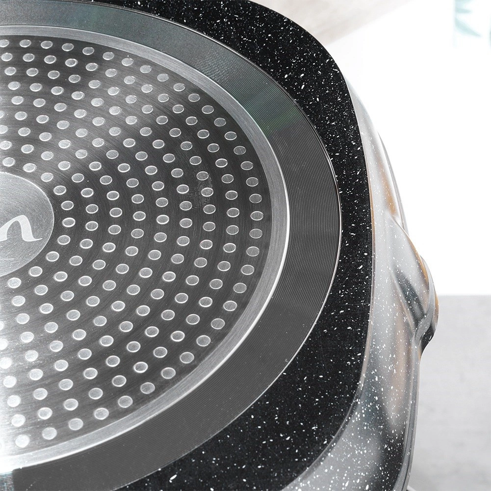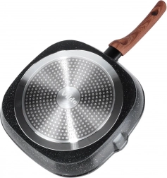 Masívne telo z liateho hliníka prináša rýchle a úsporné rozohriatie, granitová nepriľnavá vrstva uľahčuje čistenie a predlžuje životnosť. Praktické dve výlevky zjednodušia prelievanie omáčok a štiav, rukoväť s dreveným vzhľadom je pohodlná, protišmyková a s očkom na zavesenie.