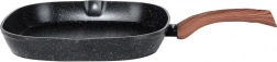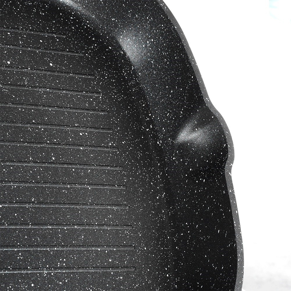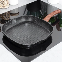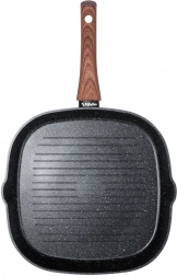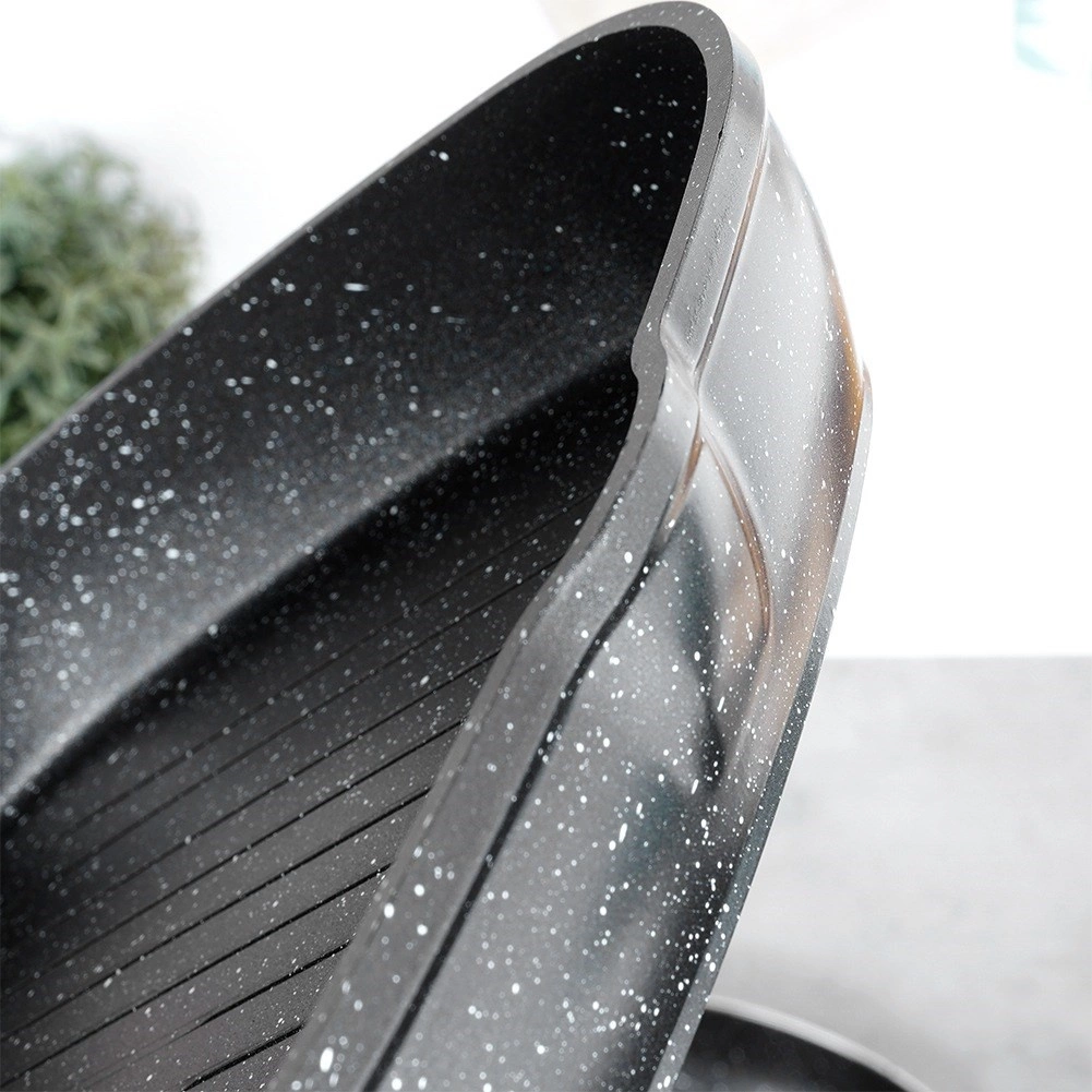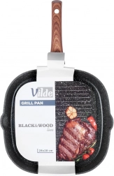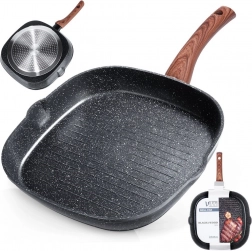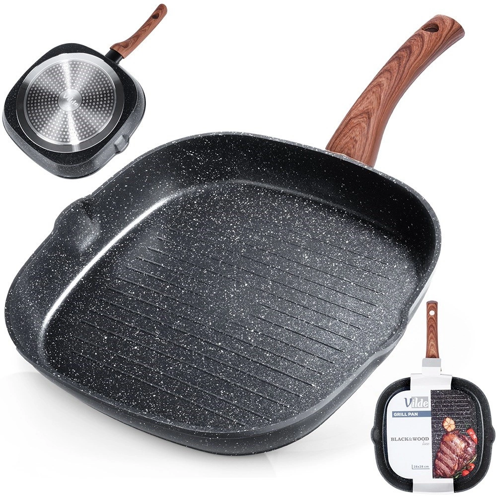 Štýlová grilovacia panvica v kombinácii čierneho kamenného vzhľadu a dreva dodá kuchyni moderný nádych a umožní zdravé varenie s minimom tuku. Vyššie rebrovanie odvádza prebytočný tuk, zaručuje sýte sear stopy a šťavnatý výsledok pri mäse, zelenine aj burgroch.