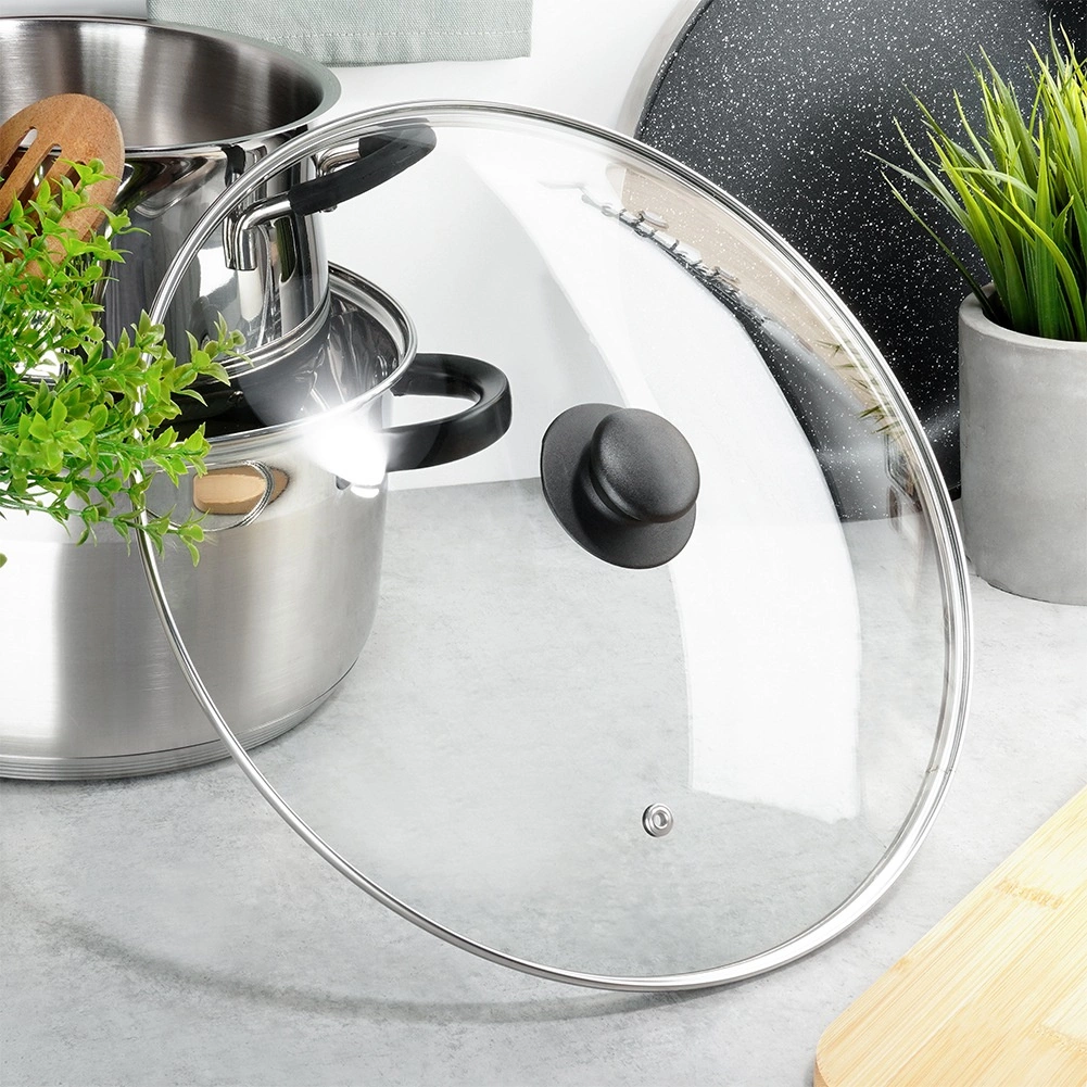 Táto univerzálna sklenená pokrievka sa dokonale hodí na hrnce, panvice aj rajnice s priemerom 32 cm. Vďaka priehľadnému žiaruvzdornému sklu máte neustály prehľad o priebehu varenia bez nutnosti pokrievku dvíhať, čo šetrí energiu aj čas. Nerezový lem zaručuje dlhú životnosť a vysoký rantl prispieva k pevnému a tesnému dosadnutiu na riad.