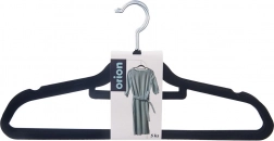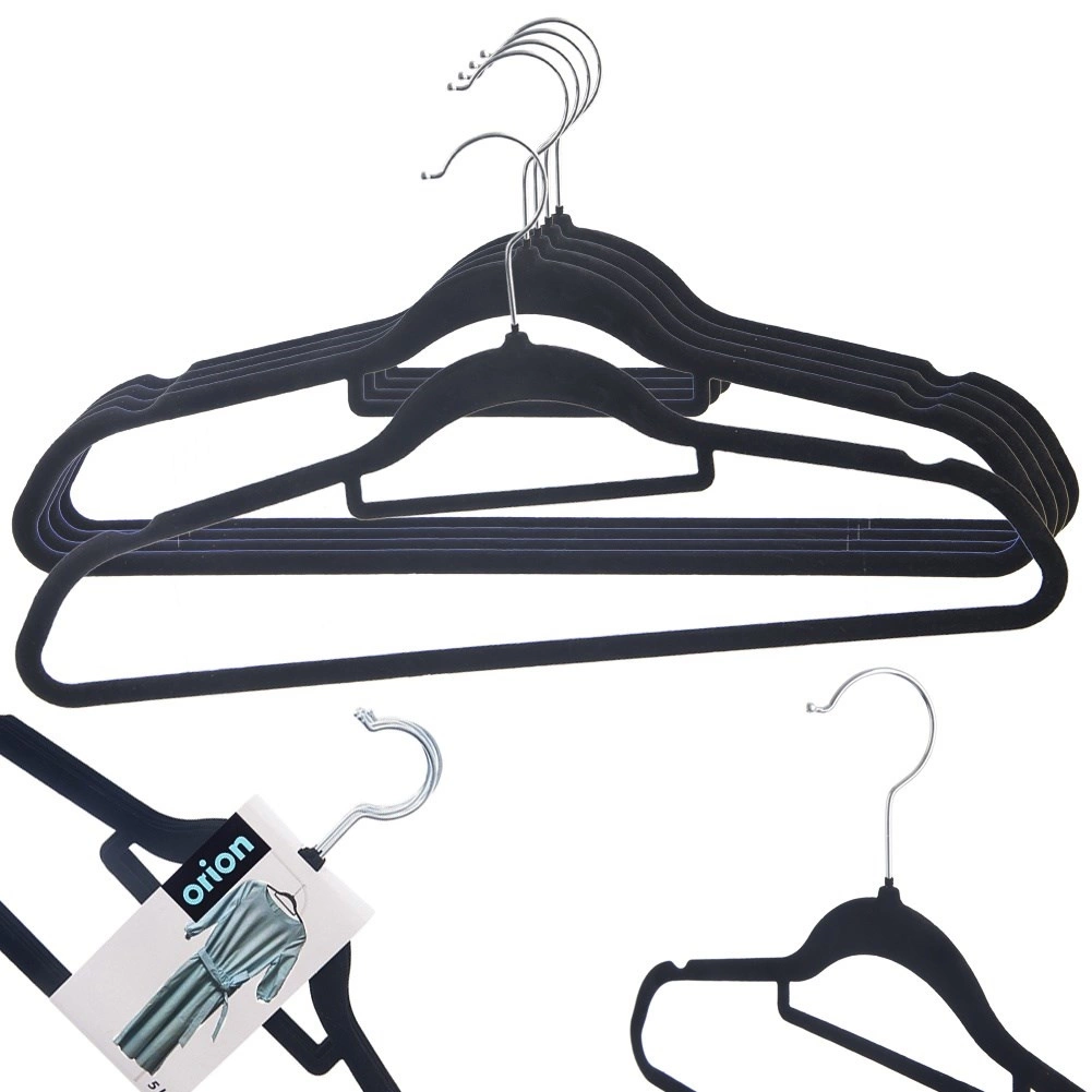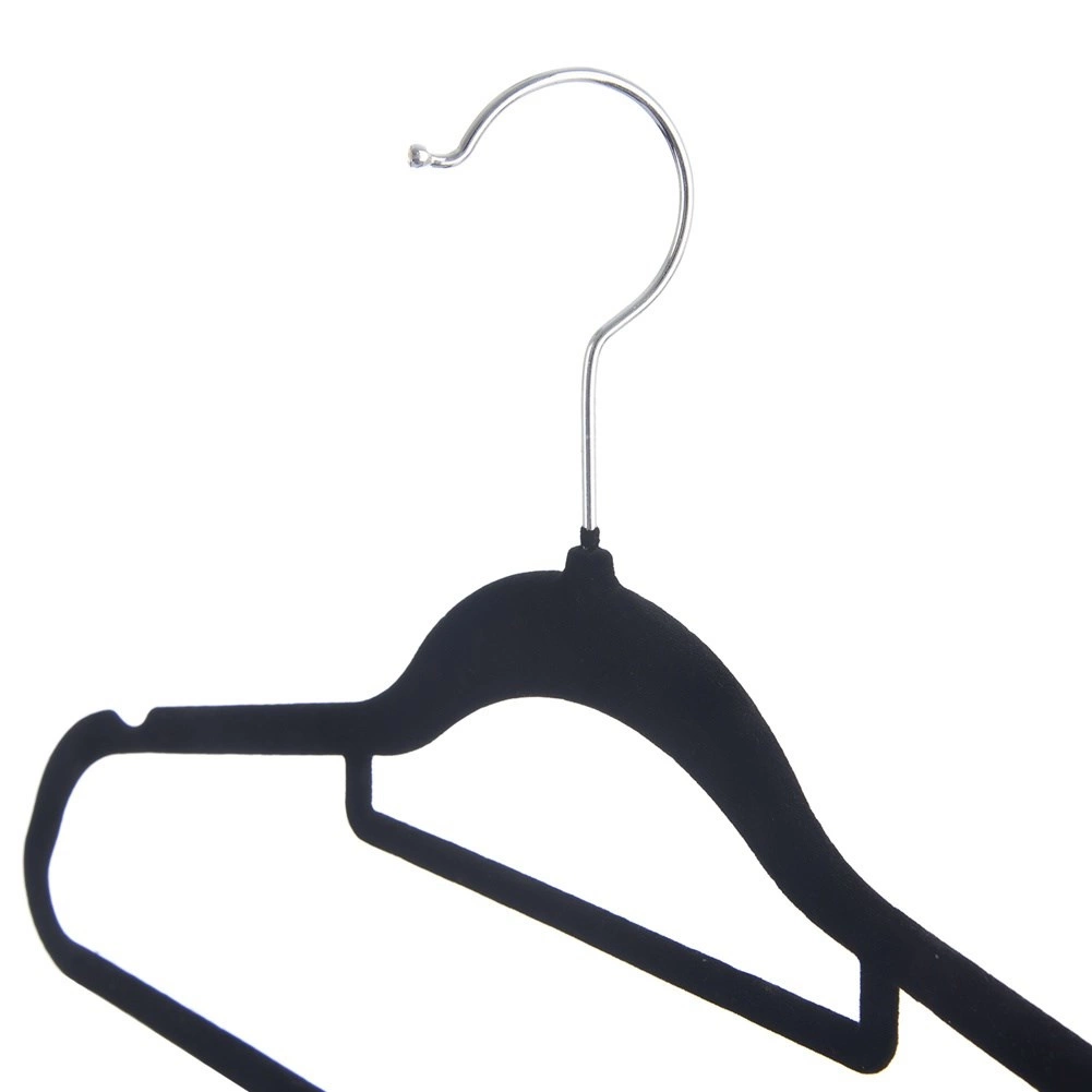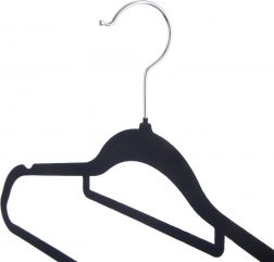 Praktická sada 5 čiernych velúrových vešiakov s protisklzovým povrchom a otočným kovovým háčikom na perfektnú organizáciu šatníka. Štíhly profil šetrí miesto, ramená majú zárezy na ramienka/blúzky a spodnú tyč na nohavice či šály. Rozmery jedného kusu 45 × 23,5 × 0,5 cm – ideálne do domácnosti aj predajní.