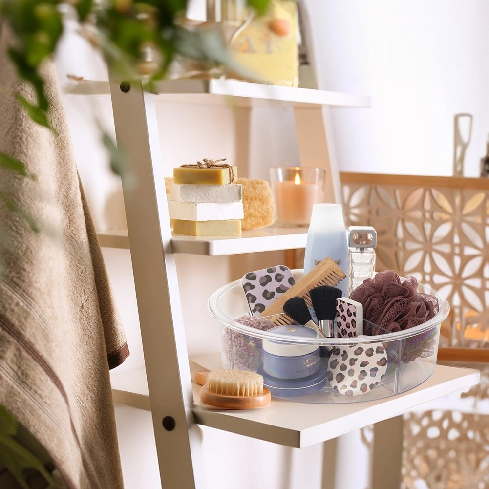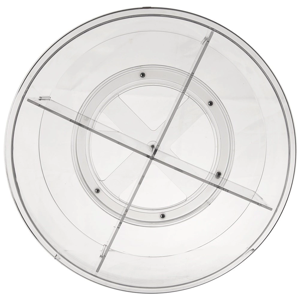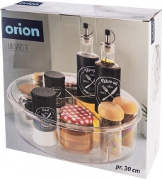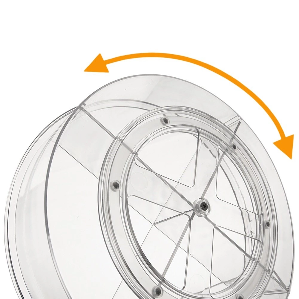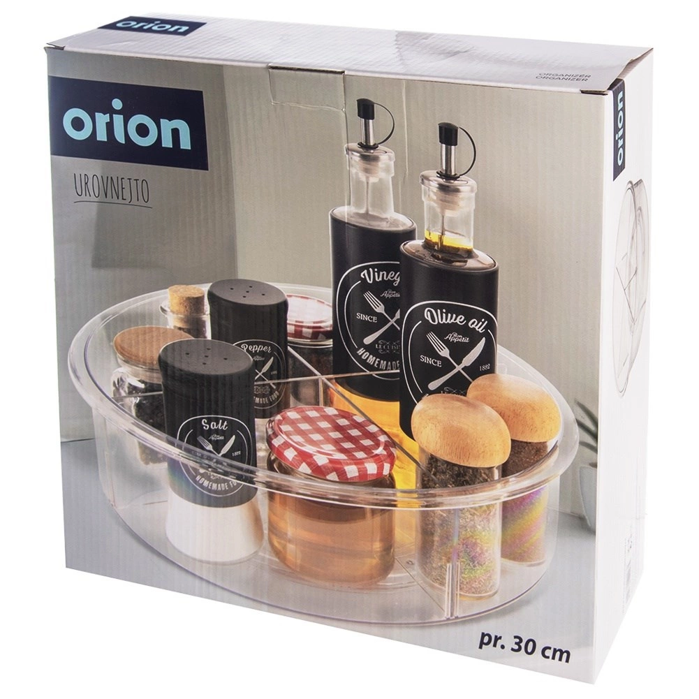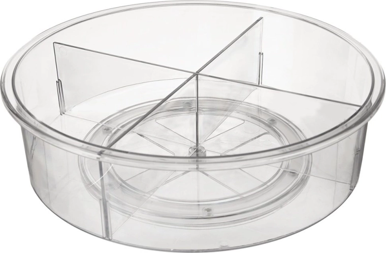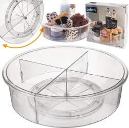 Praktický otočný organizér s priemerom 30 cm a výškou 9 cm prináša poriadok do kuchyne, kúpeľne aj špajze. Vďaka základni s hladkým chodom sa otáča o 360°, takže máte všetko rýchlo po ruke. Priehľadné prevedenie a 4 oddelené sekcie uľahčujú prehľadné triedenie korenín, kozmetiky, fliaš aj pohárov, zatiaľ čo vyššie okraje bránia vypadávaniu pri otáčaní.