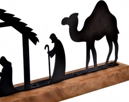Jemne laserované čierne siluety maštale, Svätej rodiny, pastierov, zvierat a ťavy vytvárajú výrazný, no pritom decentný sviatočný motív.