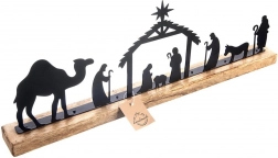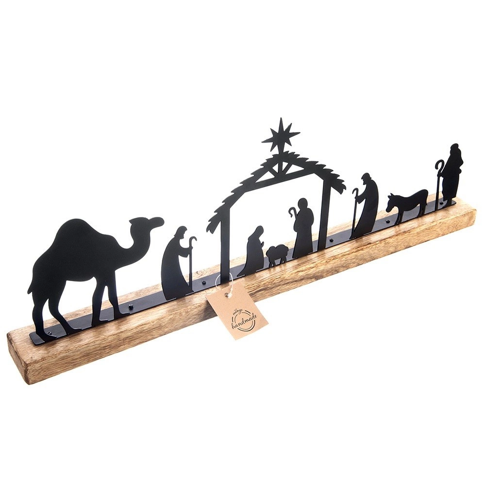 Elegantný stolový betlehem z kombinácie dreva mangovníka a čierneho kovu prinesie do vášho domova čaro Vianoc. Minimalistické siluety Svätej rodiny, pastierov a zvierat na masívnom drevenom podstavci tvoria štýlovú vianočnú dekoráciu s rustikálnym nádychom a dlhou životnosťou.