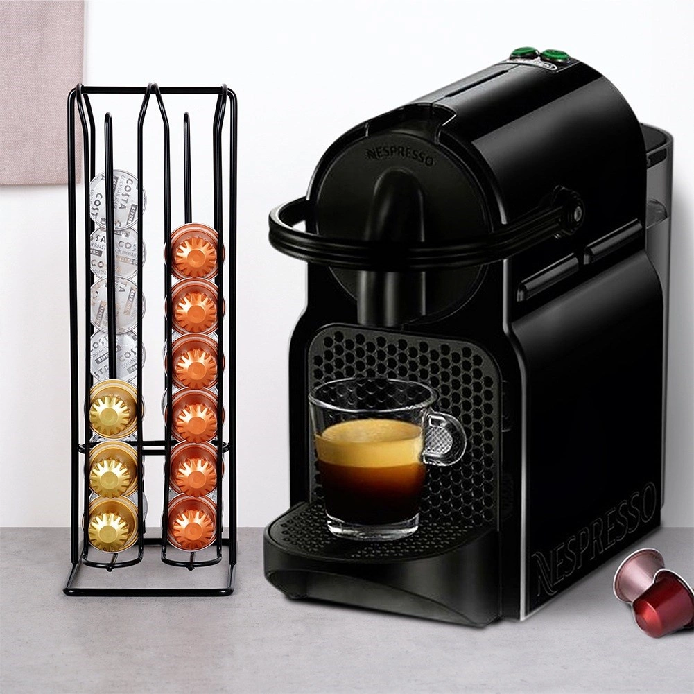 Elegantný a stabilný stojan na kapsuly kompatibilný s NESPRESSO pojme až 32 kapsúl v štyroch radoch. Má kompaktné rozmery 12,5 × 10 × 30 cm, je vyrobený z kvalitného čierneho kovu a vďaka praktickej konštrukcii zaistí rýchly prístup k obľúbeným príchutiam, úsporu miesta na kuchynskej linke a štýlový vzhľad vašej kuchyne.