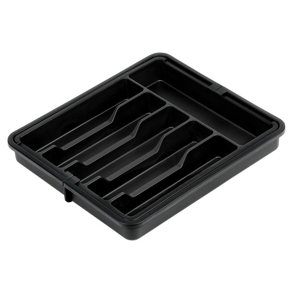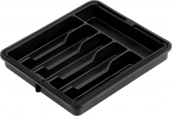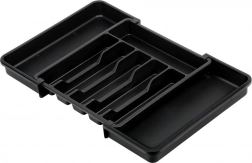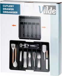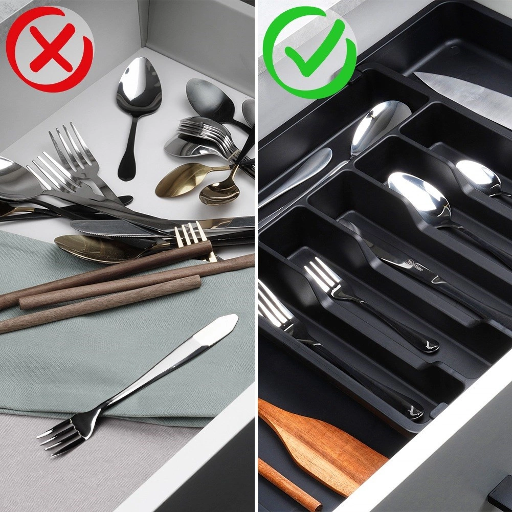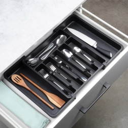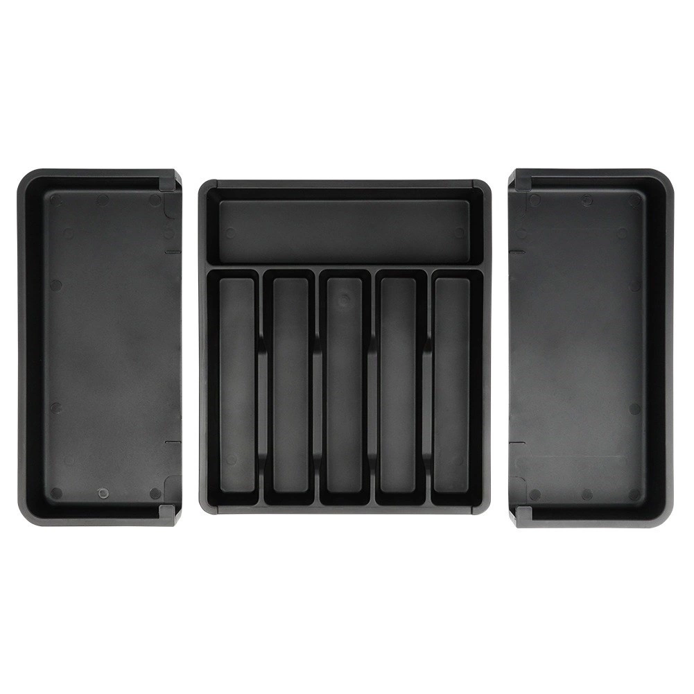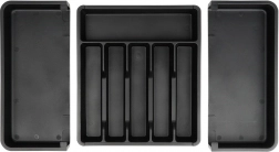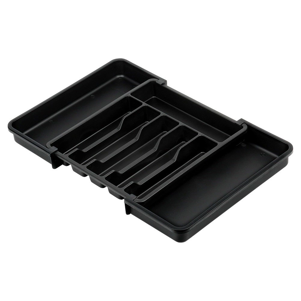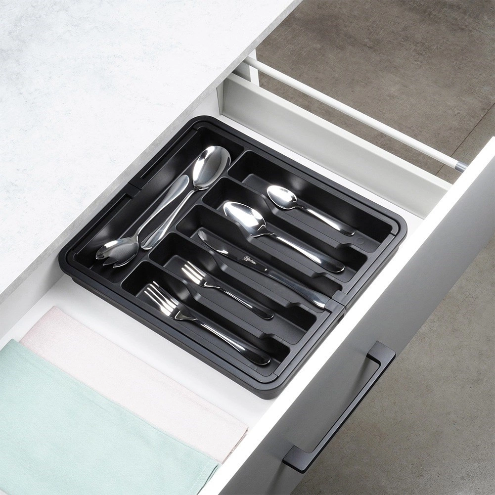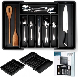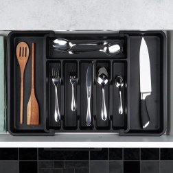 Praktický rozťahovateľný organizér do zásuvky udrží vaše príbory a kuchynské náradie vždy prehľadne na svojom mieste. Vďaka šírke nastaviteľnej od 33 do 56,5 cm sa ľahko prispôsobí väčšine zásuviek, má mnoho priehradiek na nože, vidličky, lyžice aj varešky a je vyrobený z odolného plastu v elegantnej čiernej farbe pre dlhú životnosť a jednoduché čistenie.