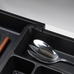 Organizér je vyrobený z pevného a odolného plastu s hladkým povrchom pre jednoduchú údržbu. Elegantné čierne prevedenie sa hodí do moderných aj klasických kuchýň a pomáha udržať dokonalý poriadok v každodennej prevádzke.