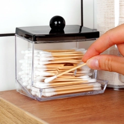 Praktický organizér na vatové tyčinky z číreho akrylu s pohodlným viečkom a predným otvorom na jednoduché dávkovanie. Udrží tyčinky hygienicky čisté, chránené pred prachom a vždy po ruke. Kompaktné rozmery a moderný dizajn elegantne doplnia každú kúpeľňu.