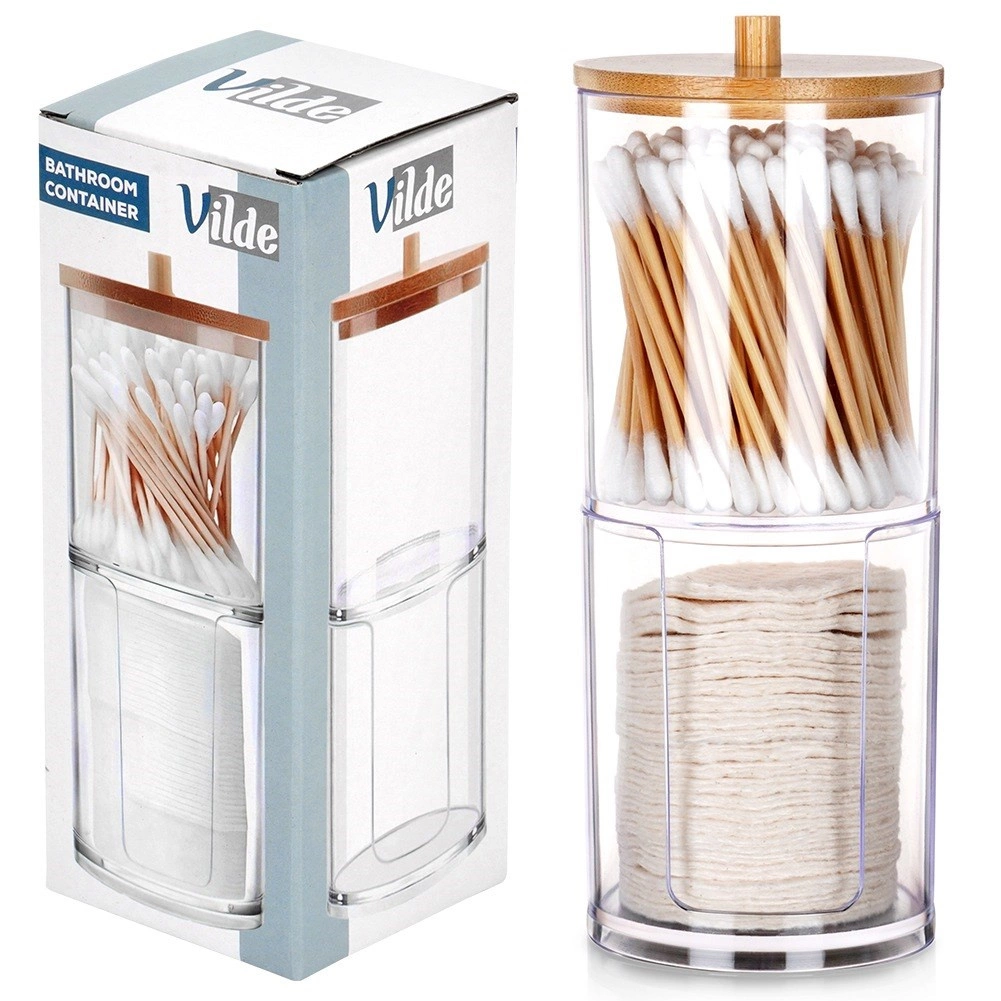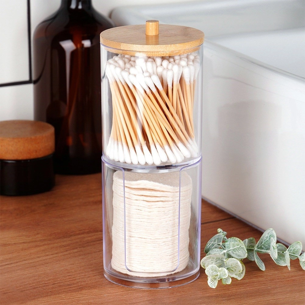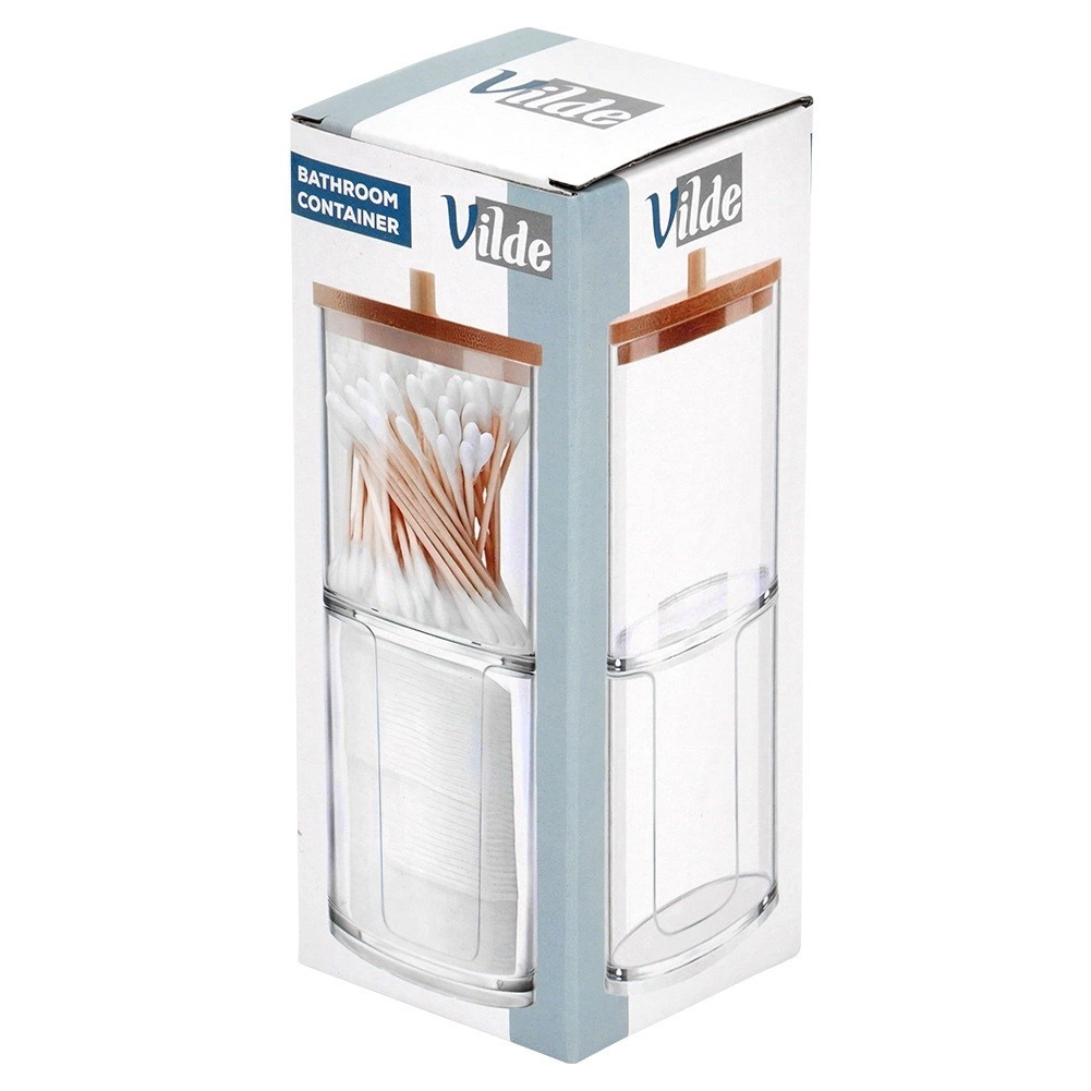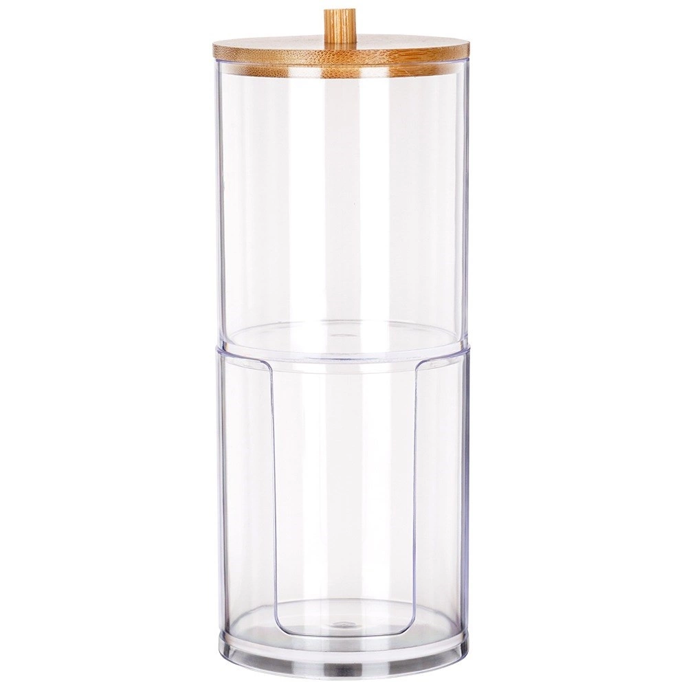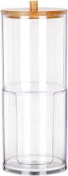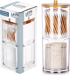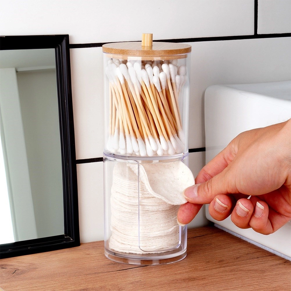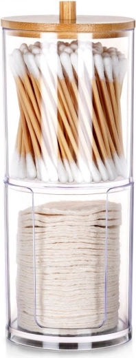 Elegantný a funkčný doplnok do každej kúpeľne. Dve oddelené priehradky z číreho akrylu zabezpečujú hygienické a prehľadné uloženie vatových tyčiniek aj guľatých tampónov. Horná časť je krytá bambusovým viečkom s úchytom, spodná sekcia má predný výrez pre ľahké dávkovanie.