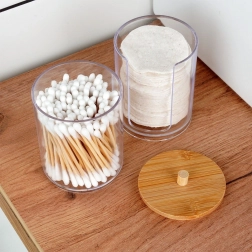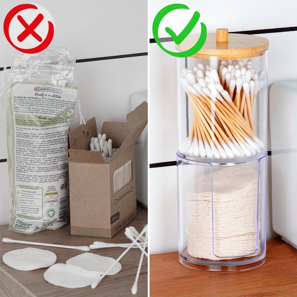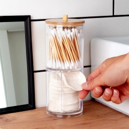 Oddelte vatové tyčinky a tampóny v jednom kompaktnom organizéri. Číry materiál zaistí okamžitý prehľad a elegantný vzhľad.