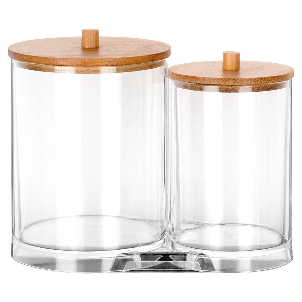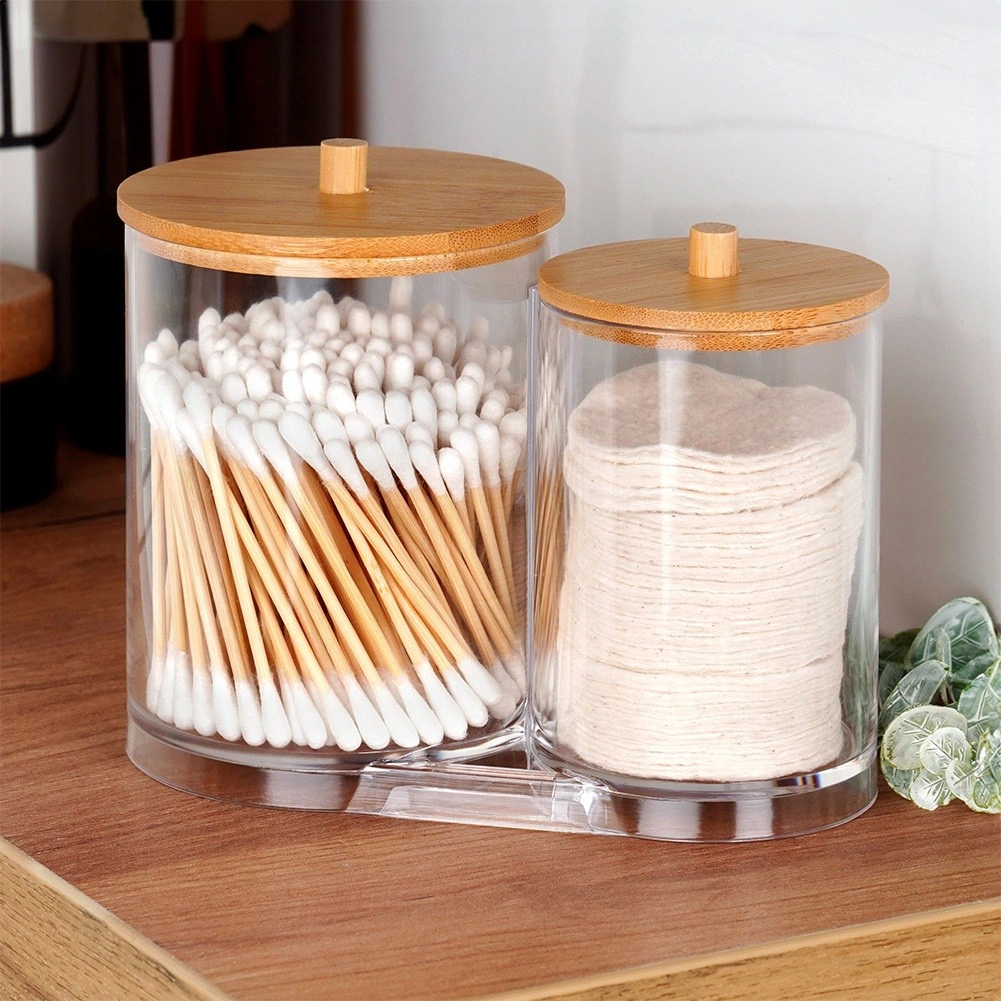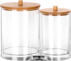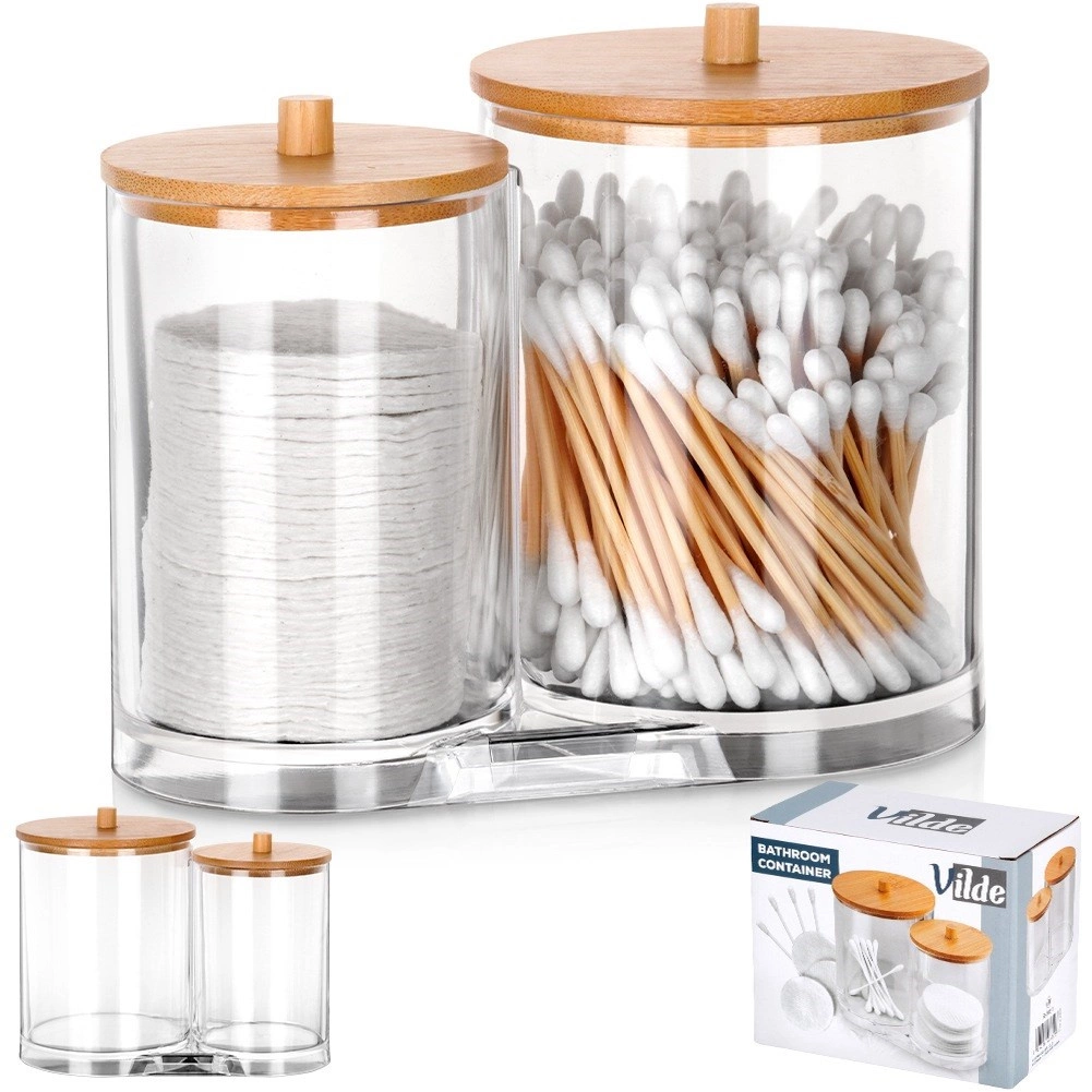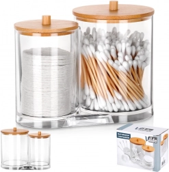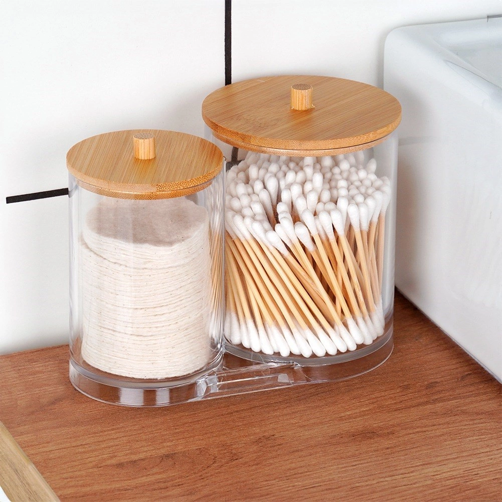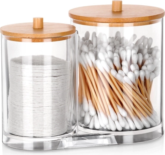 Elegantné a funkčné riešenie pre každodennú rutinu v kúpeľni. Dva prepojené zásobníky z odolného číreho akrylu poskytujú samostatný priestor pre vatové tyčinky a odličovacie tampóny, takže všetko zostáva čisté, dostupné a krásne usporiadané. Bambusové viečka s praktickými úchytmi chránia obsah pred prachom a dodávajú prírodný, moderný vzhľad.