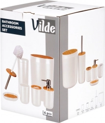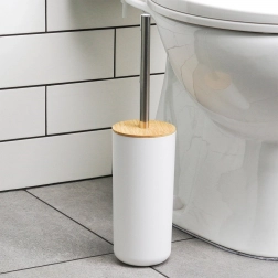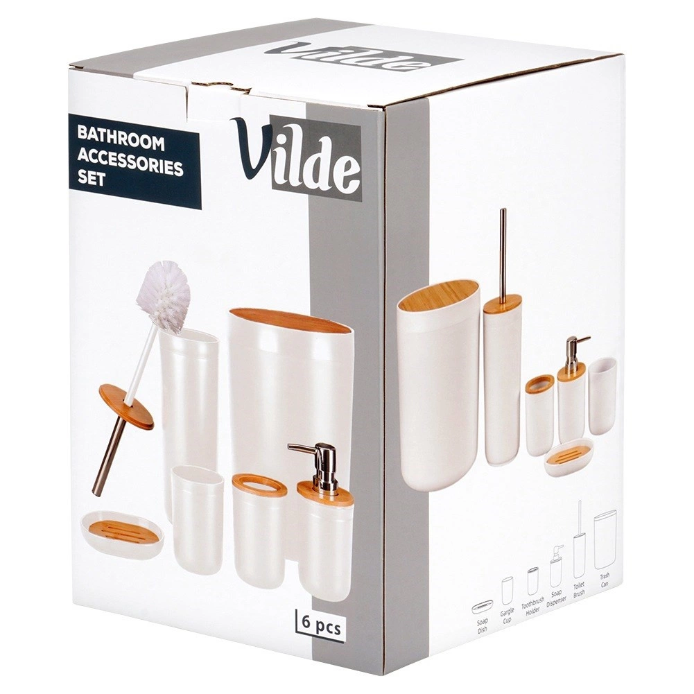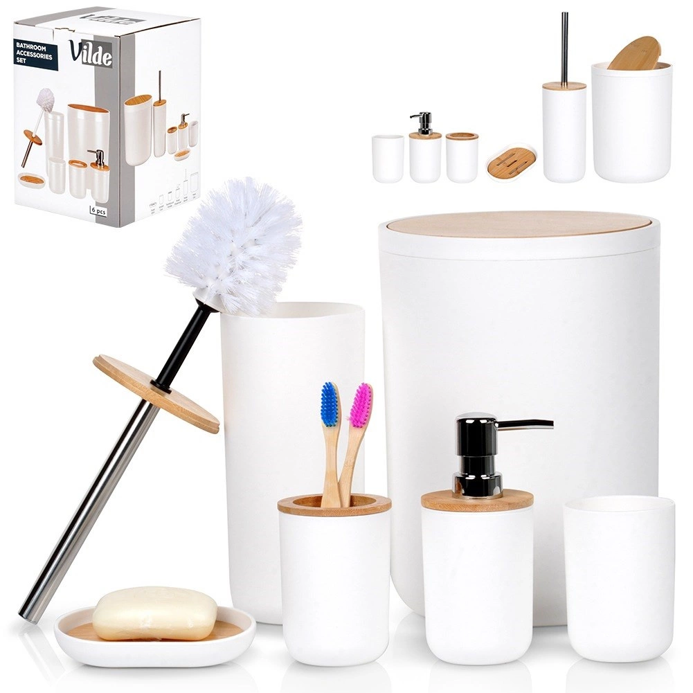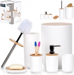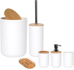 Sada zjednocuje vzhľad kúpeľne a poskytuje všetko potrebné: dávkovač, mydelničku, držiak na kefky, pohárik, WC kefu a odpadkový kôš. Minimalistický biely dizajn s bambusom pôsobí teplo a čisto.