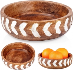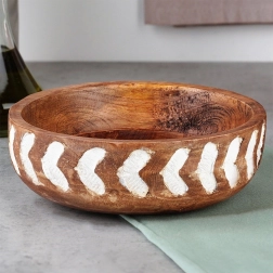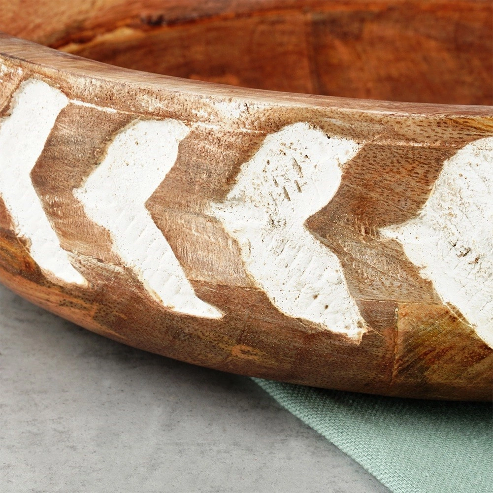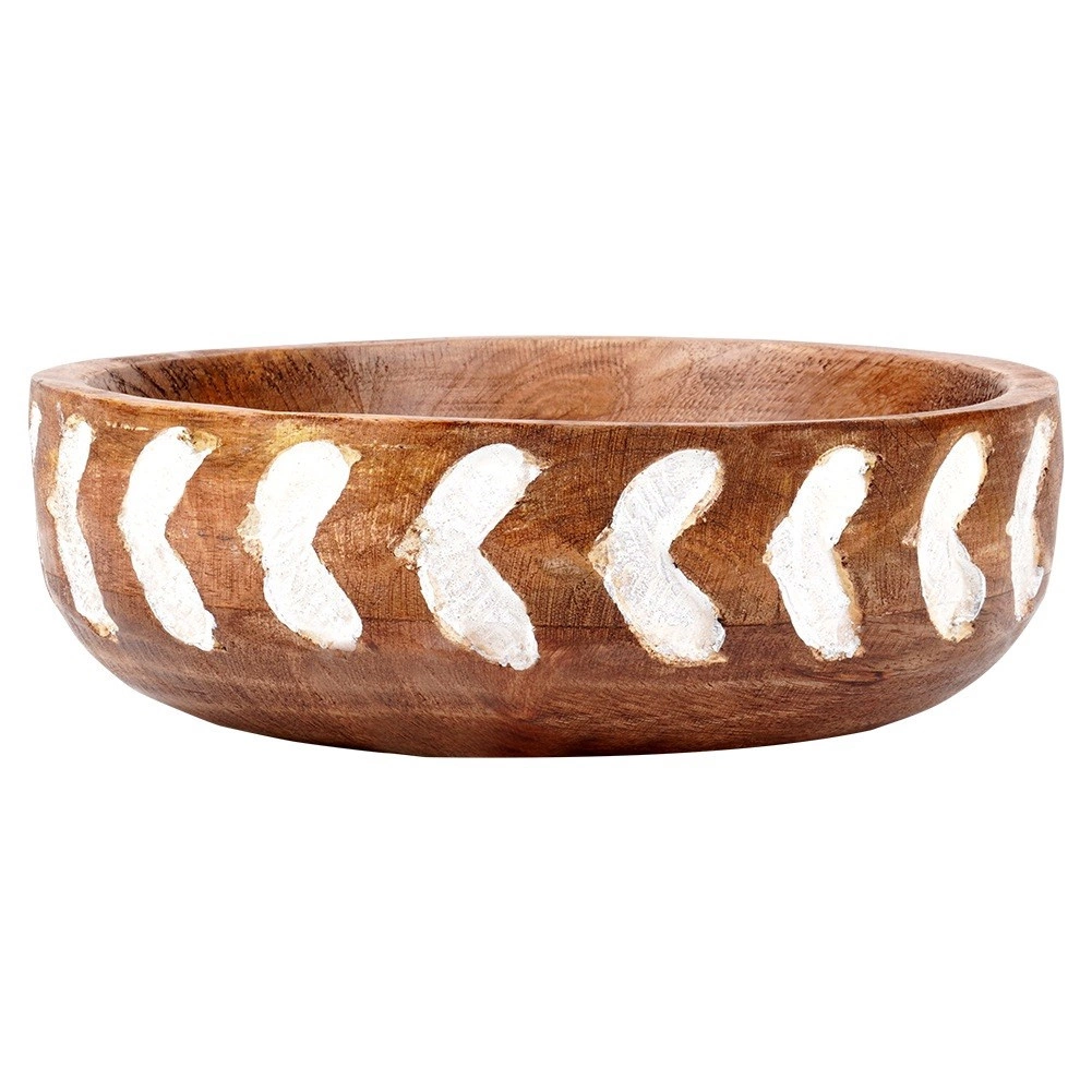Táto miska z kvalitného mangového dreva krásne doplní váš stôl aj interiér. Široký a plytký profil uľahčuje servírovanie šalátov, ovocia, orieškov či drobných pochutín. Ručne maľovaný a vyrezávaný biely vzor na vonkajšom okraji podčiarkuje prirodzenú kresbu dreva a dodáva miske jedinečný, rustikálny charakter.