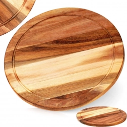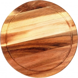 Kvalitná drevená doska z prírodného akáciového dreva spája funkčnosť a estetiku. Okrúhly tvar s hlbokým žliabkom zachytí šťavy a omrvinky, takže pracovná plocha zostane čistá. Hrúbka 1,5 cm zaisťuje stabilitu a dlhú životnosť.